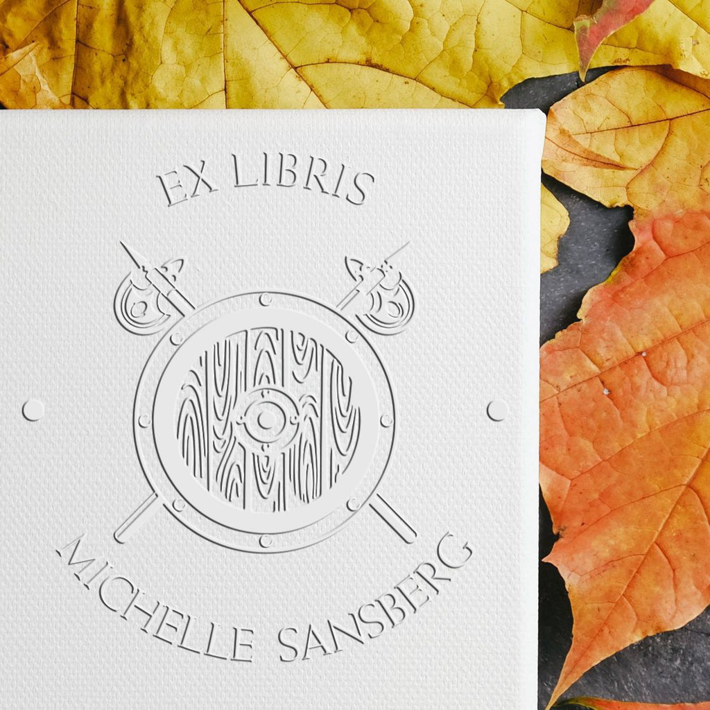 Crafted for the discerning collector, this premium embosser features an intricate battle-ready design: a masterfully detailed wooden shield with authentic grain patterns, encircled by a metal-edged border adorned with tactical bumps. Two mighty battle axes cross behind the shield, their blades reaching skyward in a display of power and protection for your precious tomes.