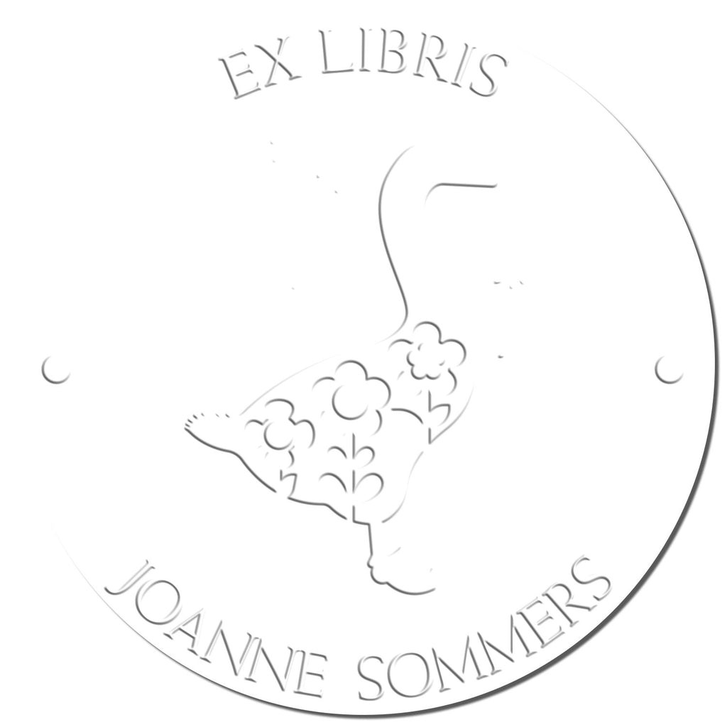 The star of this custom-made library bookplate embossing stamp is its delightful design - a graceful goose silhouette housing three beautiful blooming flowers with elegant stems and leaves. Each impression creates a crisp, professional-quality mark that adds a touch of whimsy to any book page.