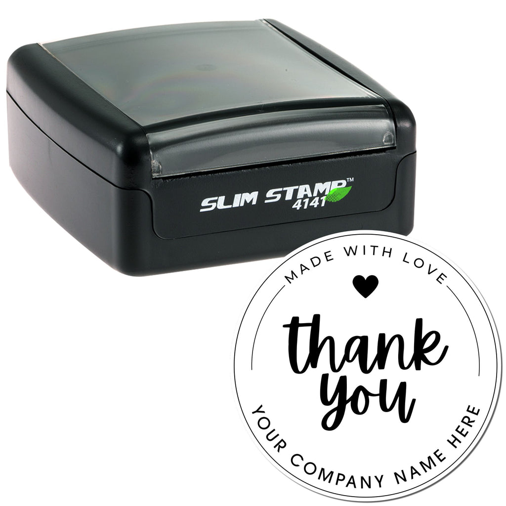 Expect nothing less than perfection with every stamp. The oil-based ink ensures your impressions are sharp, clear, and vibrant on any surface—be it paper, cardboard, or beyond. This personalized thank you rubber stamp features a bold "Thank You" in a stylish handwritten script, with a charming heart icon above, and "Made with Love" in a clean, uppercase font.
