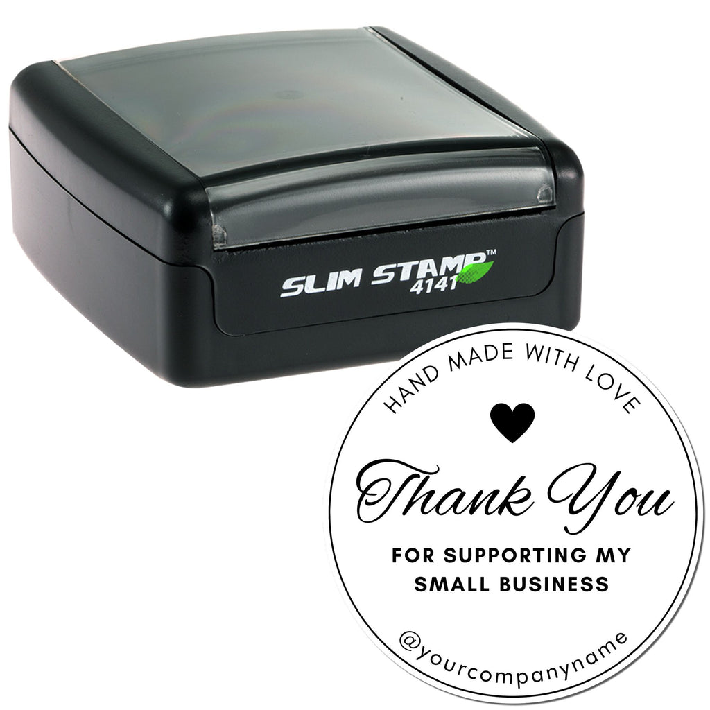 Crafted with high-quality materials, this 1-5/8" round stamp features a clean, minimalist design. The outer ring proudly displays "Hand Made with Love" at the top and "@YourCompanyName" at the bottom in a sleek, modern font. Inside, a charming heart icon sits above "Thank You" in a graceful, cursive style, followed by "FOR SUPPORTING MY SMALL BUSINESS" in bold, uppercase letters. This well-balanced design adds a personal touch to your products, making it perfect for showing appreciation to your customers.