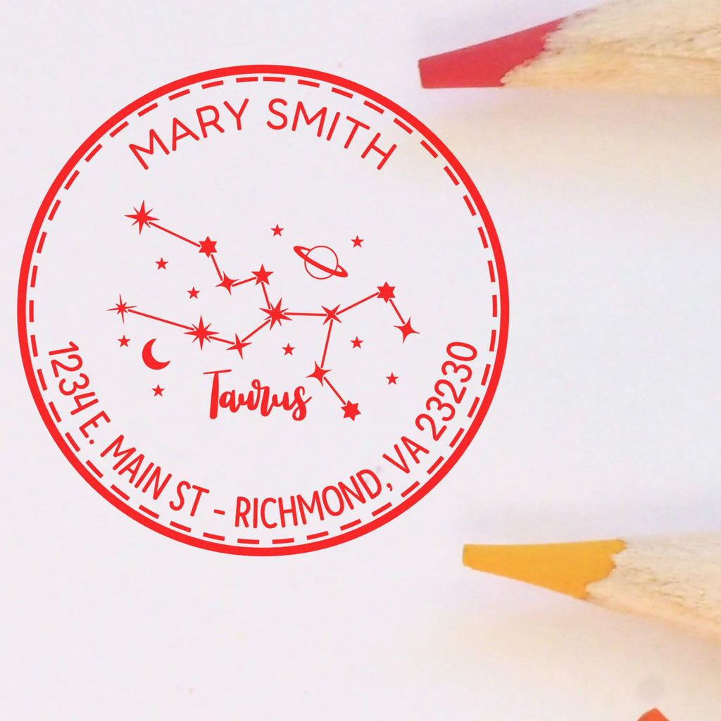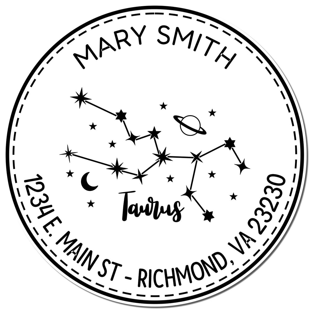 - PERSONALIZED ELEGANCE: Transform your correspondence with this celestial Taurus constellation stamp, featuring your custom name and address in an artistic circular design that makes every piece of mail uniquely yours.