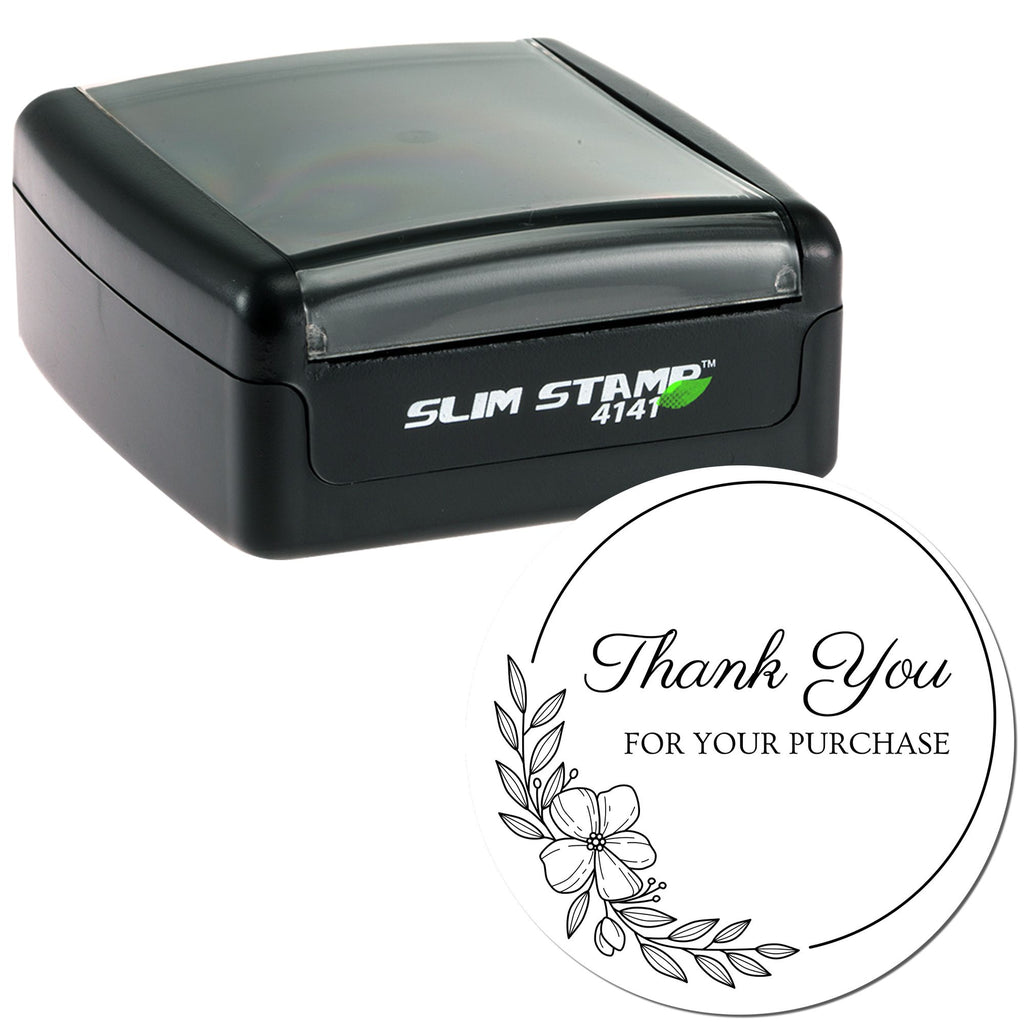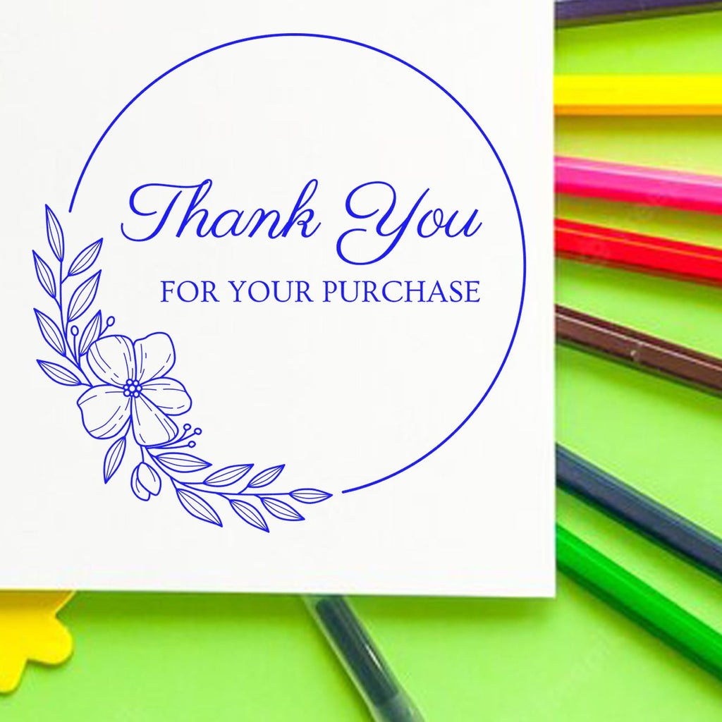 Crafted with precision, this 1-5/8" round stamp features an exquisite design combining graceful cursive and serif fonts spelling "Thank you for your purchase," adorned with a sophisticated floral motif. The delicate flower and leaf details add a touch of refined elegance to every impression.