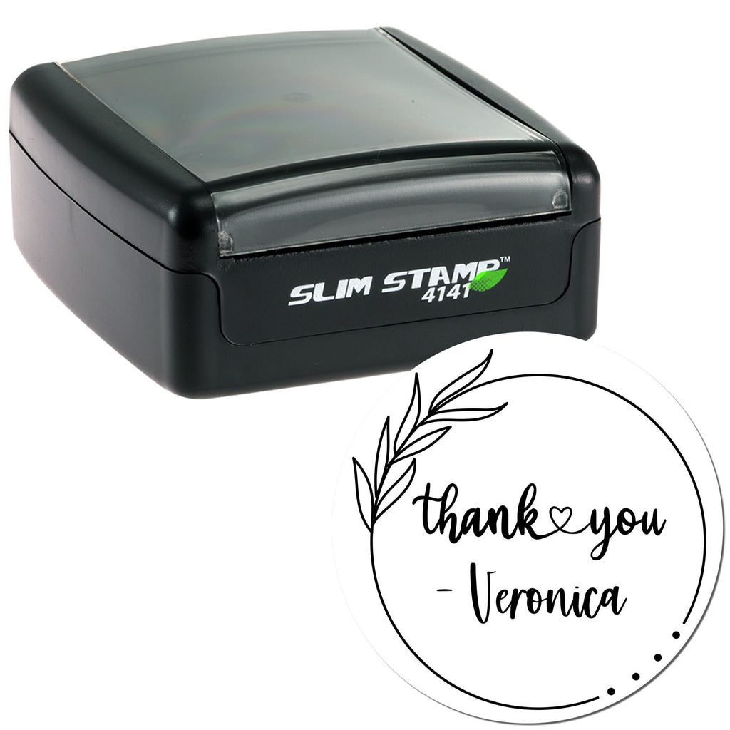 This premium 1-5/8" round pre-inked stamp features a stunning design with a graceful leafy branch, beautifully scripted "thank you" text, and customizable name placement, all enclosed in a refined circular border. The thoughtful addition of a heart detail and minimalist dots adds that extra touch of charm your customers will love.