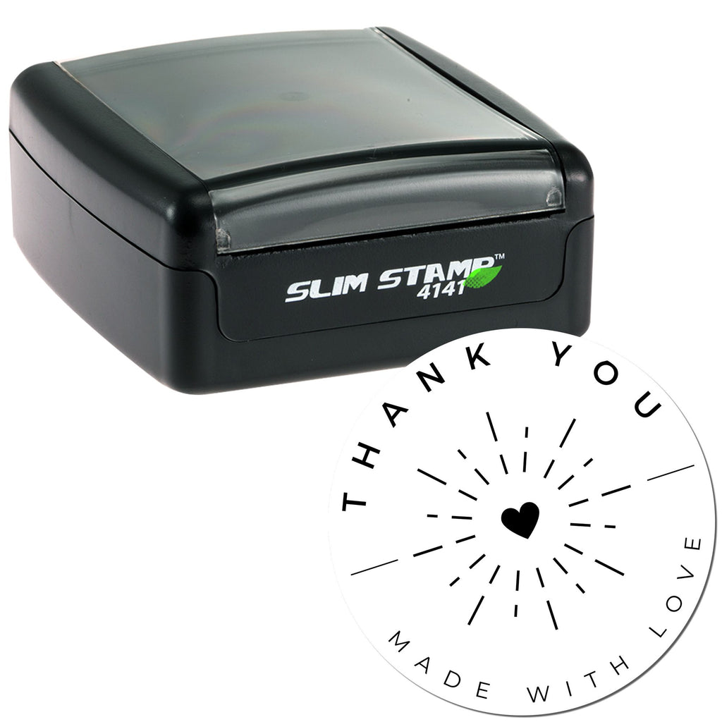 Transform your packaging and correspondence into a delightful experience with our sleek 1-5/8" round custom rubber stamp. Featuring an elegant "Thank You" message arched gracefully at the top and "Made with Love" at the bottom, complemented by a radiant heart symbol that adds warmth to every impression.