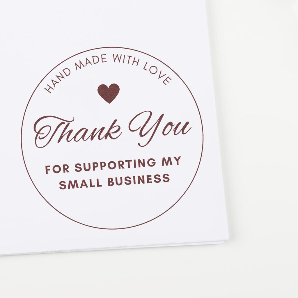 Choose from a palette of five vibrant ink colors—red, blue, green, purple, and black—to infuse your documents with a personal touch that truly pops. The 1-5/8" round design features a charming circular shape with a thin black border. "HAND MADE WITH LOVE" elegantly arches at the top, accompanied by a cute black heart, while the centerpiece "Thank You" in graceful cursive script exudes sophistication and warmth. Beneath it, "FOR SUPPORTING MY SMALL BUSINESS" is boldly printed, delivering a sincere message of gratitude.