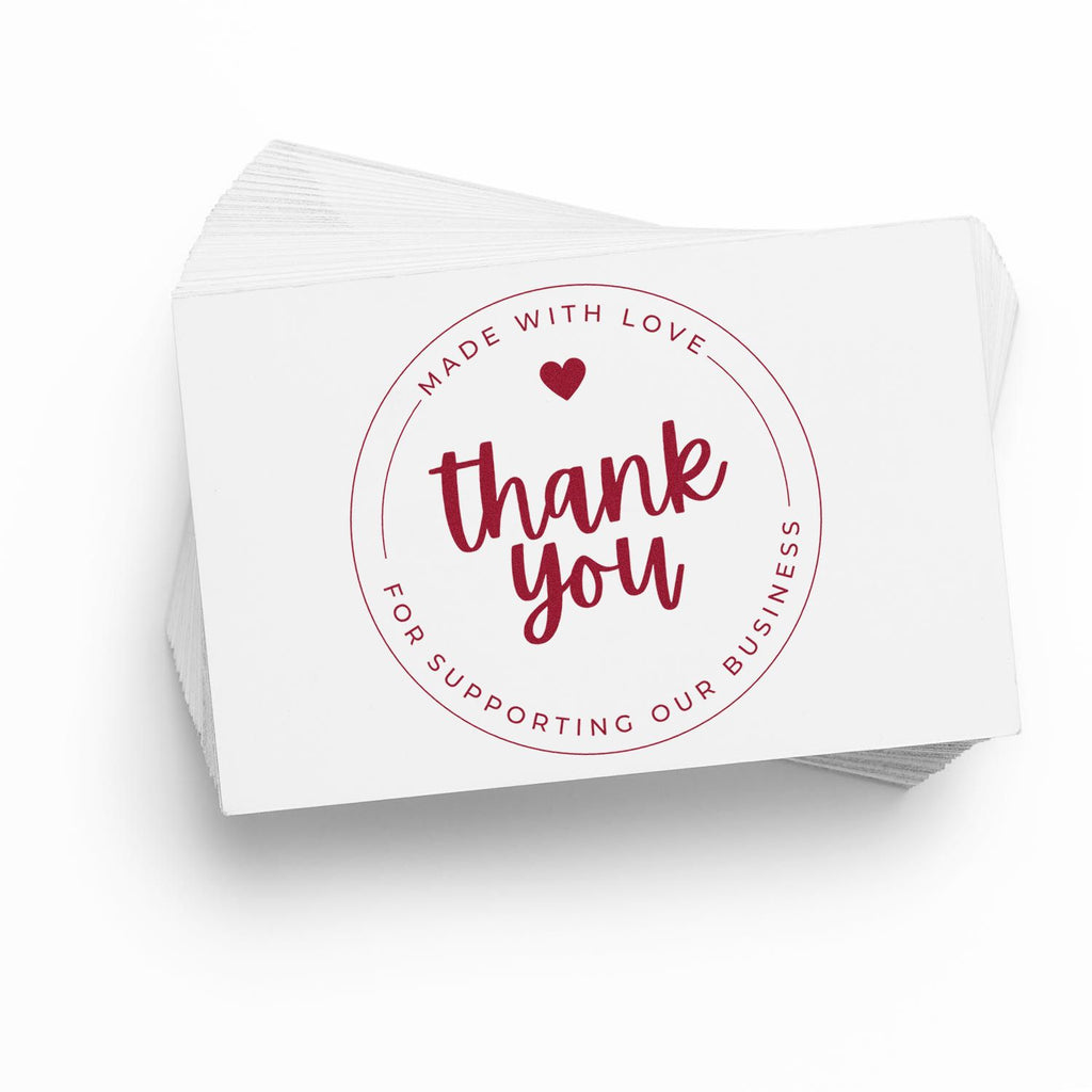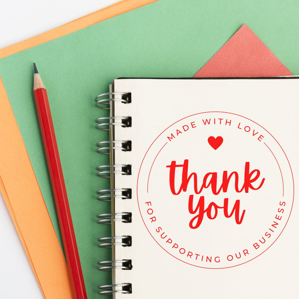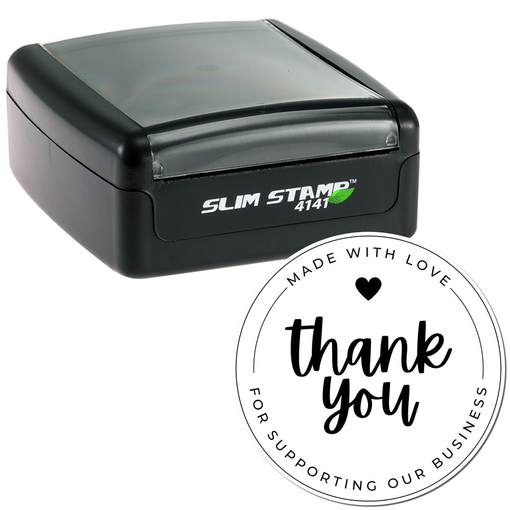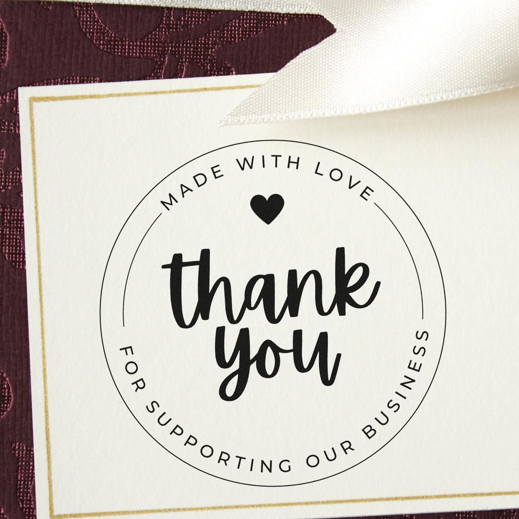 At the heart of this elegant stamp, you’ll find "Thank You" in a bold, flowing script, encircled by "MADE WITH LOVE" and "FOR SUPPORTING OUR BUSINESS" in a sleek, uppercase font. A charming heart icon adds a warm, personal touch, making it the perfect way to express your gratitude with sincerity.