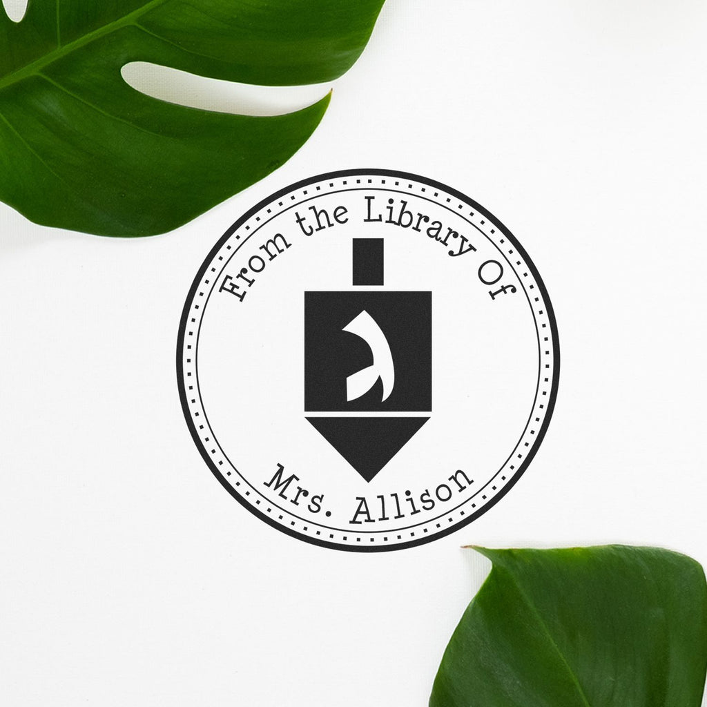 Perfect for the Holiday Season This delightful address stamp features a beautifully designed center image of a Holiday Dreidel, surrounded by a three-ring border that adds a festive touch to your mail. The design includes phrases such as "This Book Belongs To," "From The Library of," and "Ex Libris" at the top arc, allowing you to personalize it with your name or another saying at the bottom arc. With an impression size of 1-5/8" in diameter, this stamp is the perfect size for all your holiday correspondence.