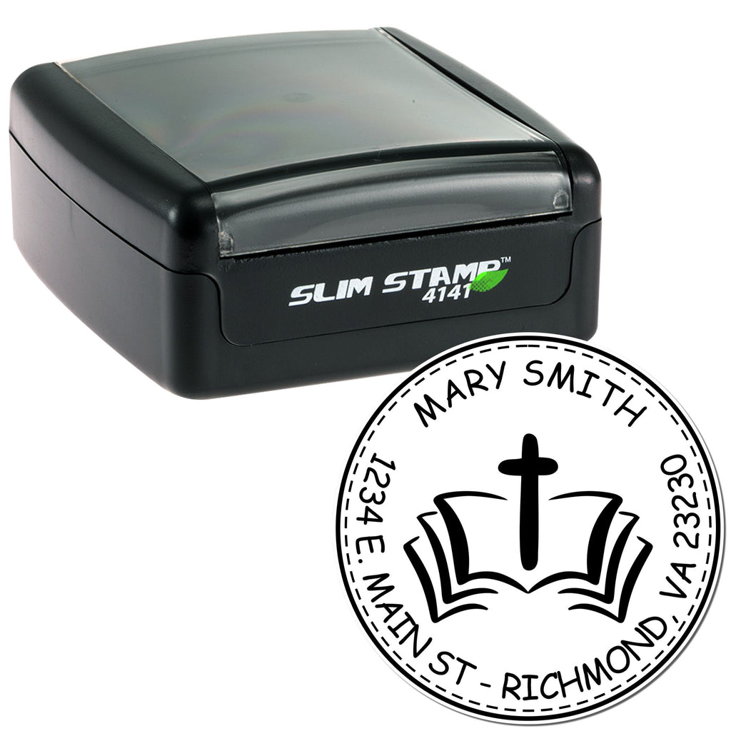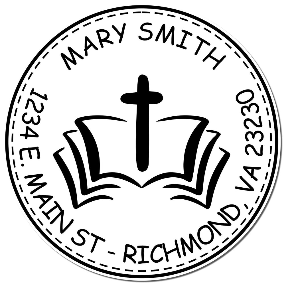 Inspiring Design This religious address stamp features a beautifully crafted design that includes a center image of Inspiring Faith with a cross nestled in the middle of a bible. The elegant double ring circular border, with a solid outer line and a dashed inner line, frames your name at the top arc, followed by your address or a meaningful saying at the bottom arc. This thoughtful design not only enhances the aesthetic of your mail but also conveys a sense of purpose and professionalism.
