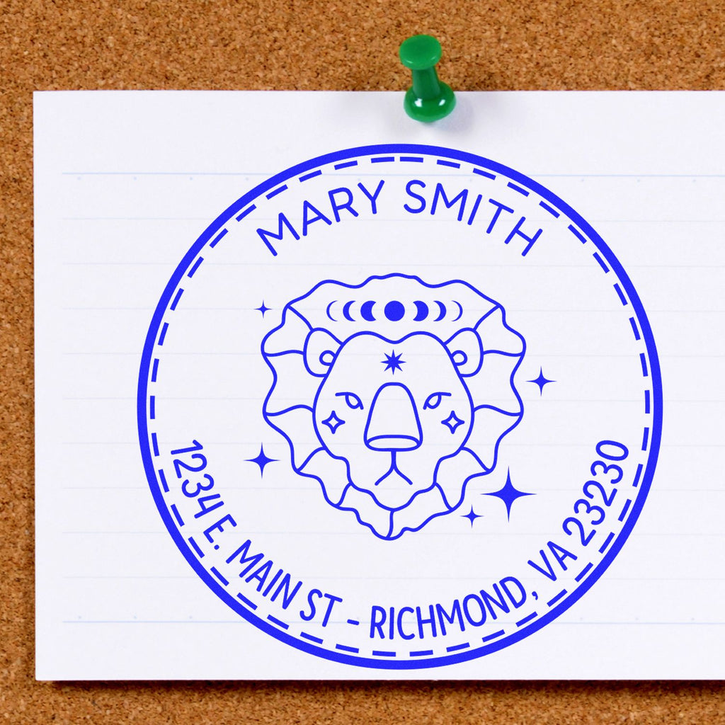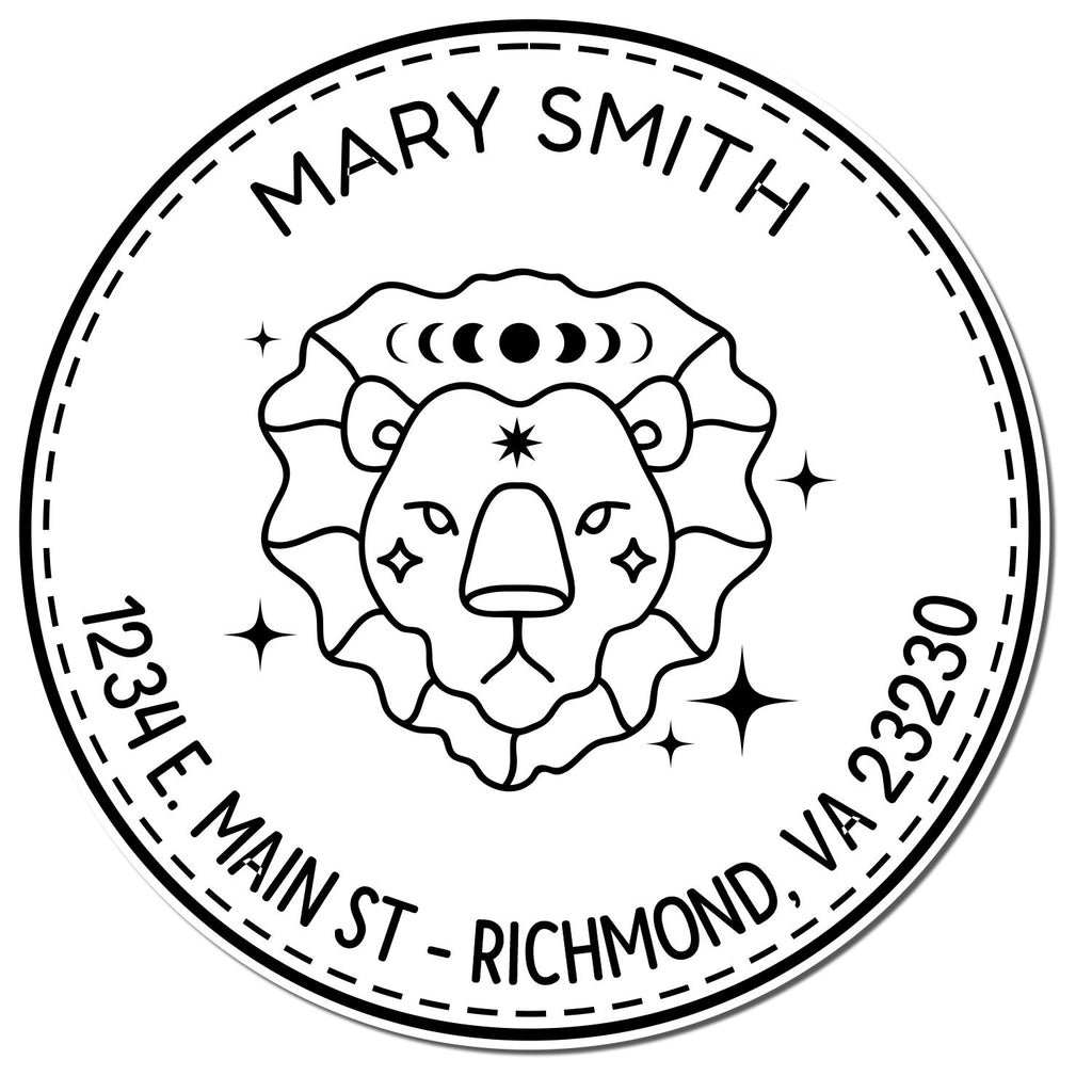 Designed for the Ambitious Leo! This zodiac address stamp features a powerful Lion, the symbol of Leo, at the center of the design. The double ring circular border, with a solid outer line and a dashed inner line, frames your name beautifully at the top arc, while your address or a personal saying graces the bottom arc. With an impression size of 1-5/8", this stamp is perfectly sized to make a bold statement without overwhelming your correspondence.