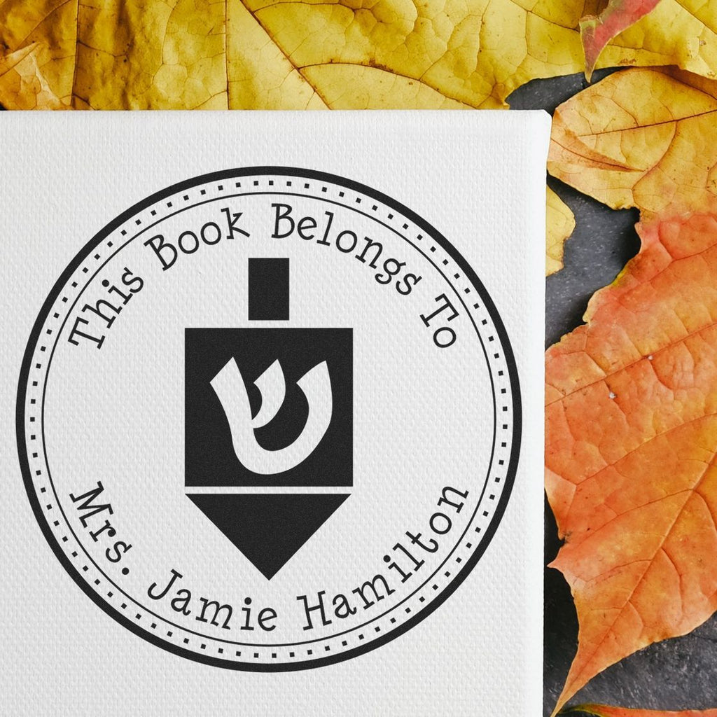 Make Your Mark with Customization What sets our Playful Dreidel Customized Name and Address Stamper apart is its unique design. Featuring a charming dreidel at the center, surrounded by a three-ring border, this stamp allows you to personalize it with phrases like "This Book Belongs To," "From The Library of," or "Ex Libris" at the top arc, followed by your name or a special saying at the bottom arc. This customization not only makes your stamp unique but also adds a personal touch to every document you stamp.