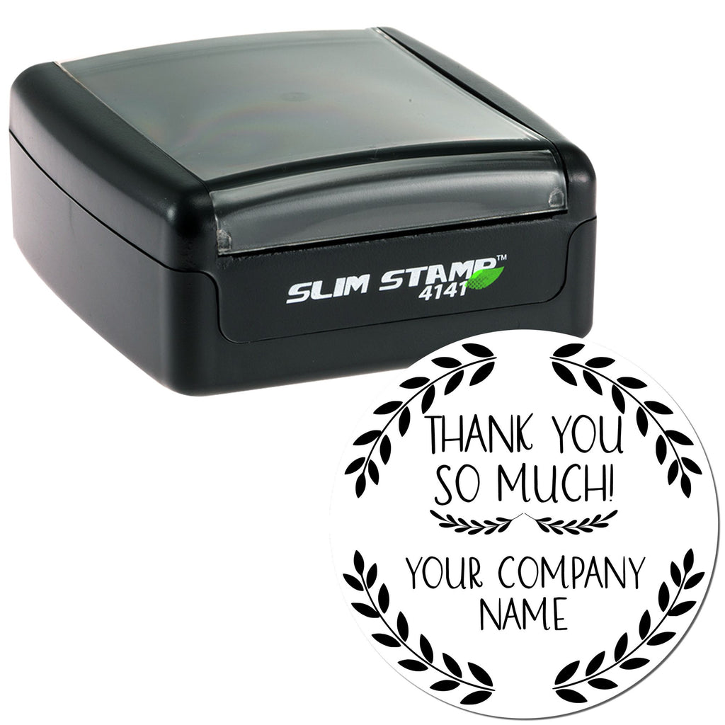 Our custom rubber stamp features a delightful "Thank you so much!" in a fun, handwritten style, with your company name elegantly displayed below. Encircled by graceful laurel branches, this classic black and white design ensures your message is clear and professional every time. With up to 15,000 smudge-resistant impressions, you can rely on this durable stamp for all your stamping needs.