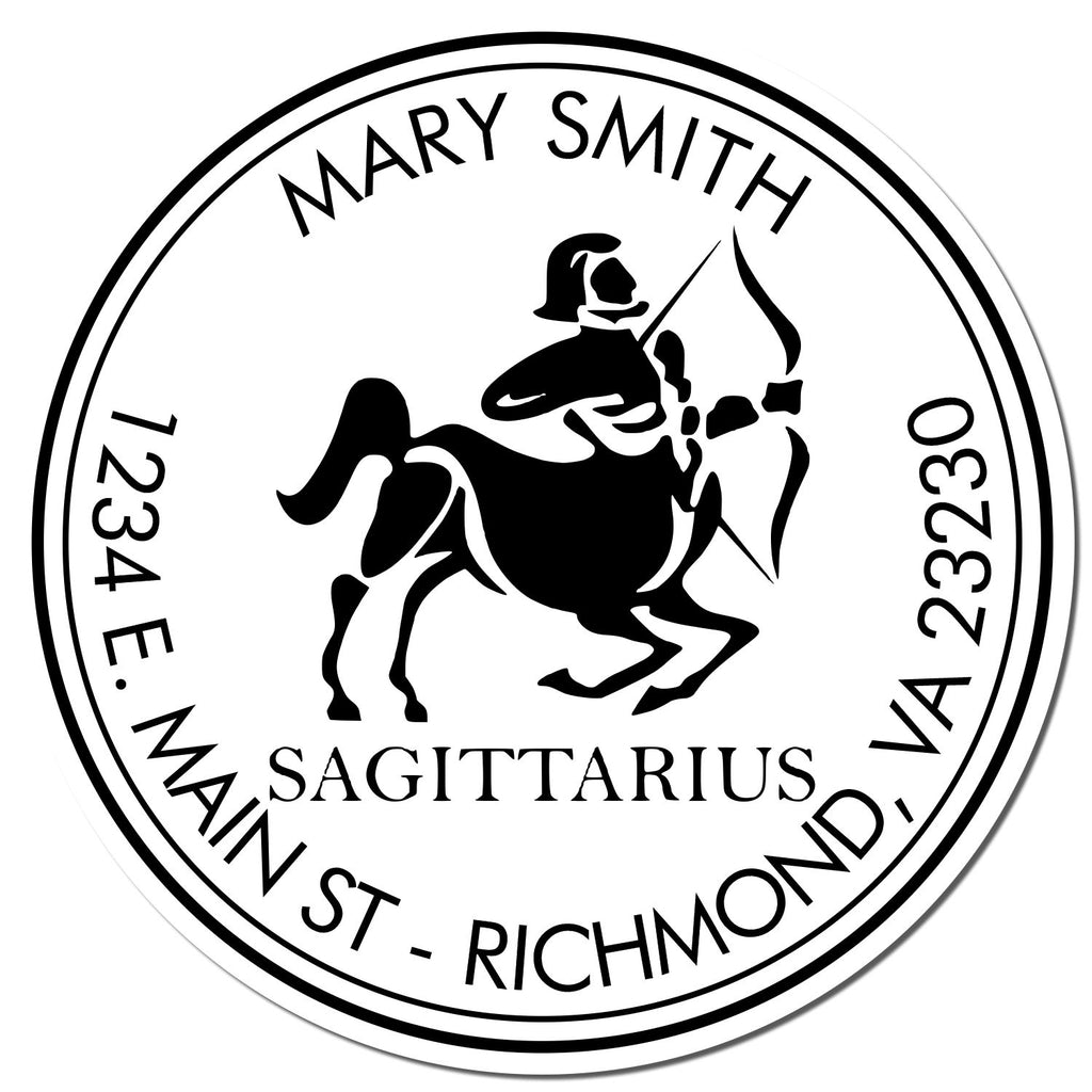 - PERSONALIZED ZODIAC DESIGN: Showcase your Sagittarius spirit with this elegant centaur and bow design, perfectly framed within a double circular border. Your name and address are artfully arranged in a classic arc formation.