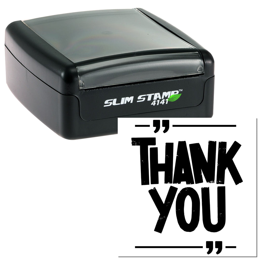 The eye-catching design features "thank you" in a bold, rugged font, framed by artistic quotation marks. Horizontal lines at the top and bottom add to its striking appearance, delivering a powerful message of gratitude. Measuring 1-5/8" square, this stamp is the perfect size for adding a personal touch to your packages and correspondence.