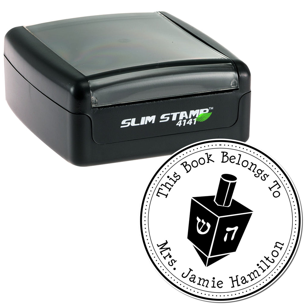 This unique stamp features a delightful center image of a Spinning Dreidel, surrounded by a stylish three-ring border. The design includes phrases such as "This Book Belongs To," "From The Library of," and "Ex Libris" at the top arc, followed by your name or a personalized saying at the bottom arc. This makes it not only a practical tool for sending mail but also a charming addition to your holiday celebrations, especially for parents or guardians of young children celebrating Hanukkah.