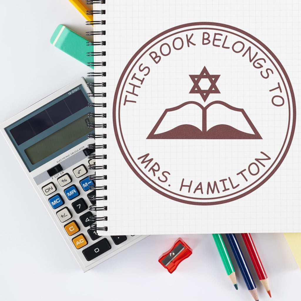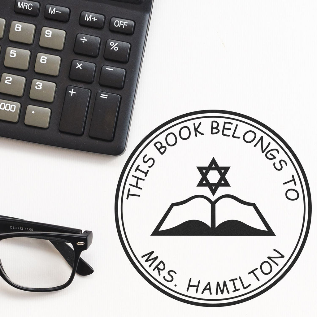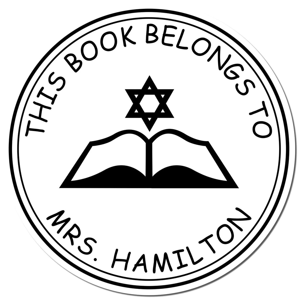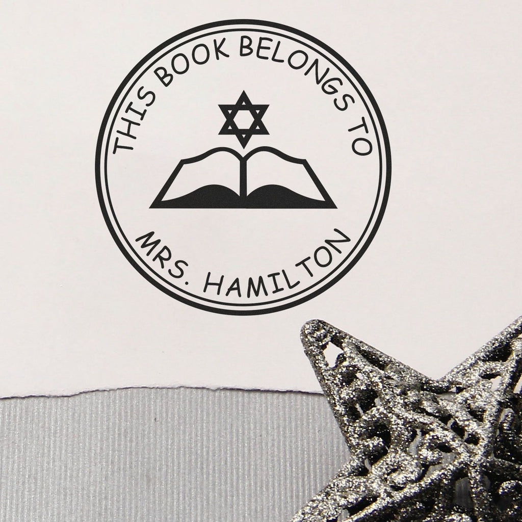 Stylish and Functional Design Measuring at a convenient 1-5/8" in diameter, this stamp features a beautifully crafted design that showcases a Star of David Torah at its center. The double concentric solid circular border elegantly frames the words "From The Library of" in the top arc, while the bottom arc reads "Read it, Love it, Return it." This thoughtful design not only looks great but also conveys a sense of tradition and respect for your documents.