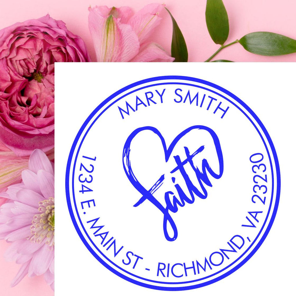 A Design That Speaks Volumes This unique religious address stamp features a stunning center image of the words "Timeless Faith" set within a heart, symbolizing the love and devotion you wish to convey. The design is framed by a double concentric solid circular border, with your name elegantly displayed in the top arc and your address in the bottom arc. With an impression size of 1-5/8", this stamp is compact yet impactful, making it a standout addition to your stationery collection.