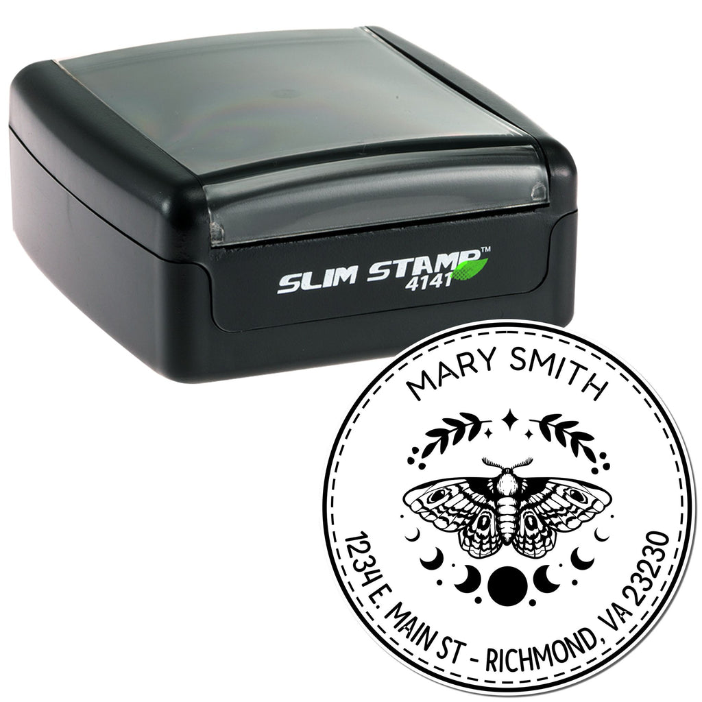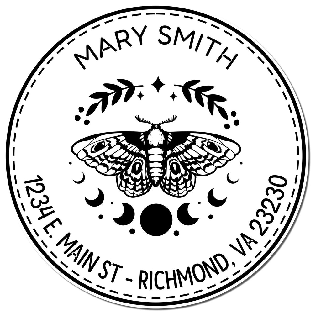 Stunning Design The Transcendent Butterfly Moth design is not just a stamp; it’s a statement of your personal style. The elegant double ring circular border, featuring a solid outer line and a charming dashed inner line, perfectly frames your personalized details. Your name elegantly arcs at the top, while your address or a special saying graces the bottom arc, creating a unique and memorable impression every time. Transform your mail into a work of art and make every envelope a delight to receive!