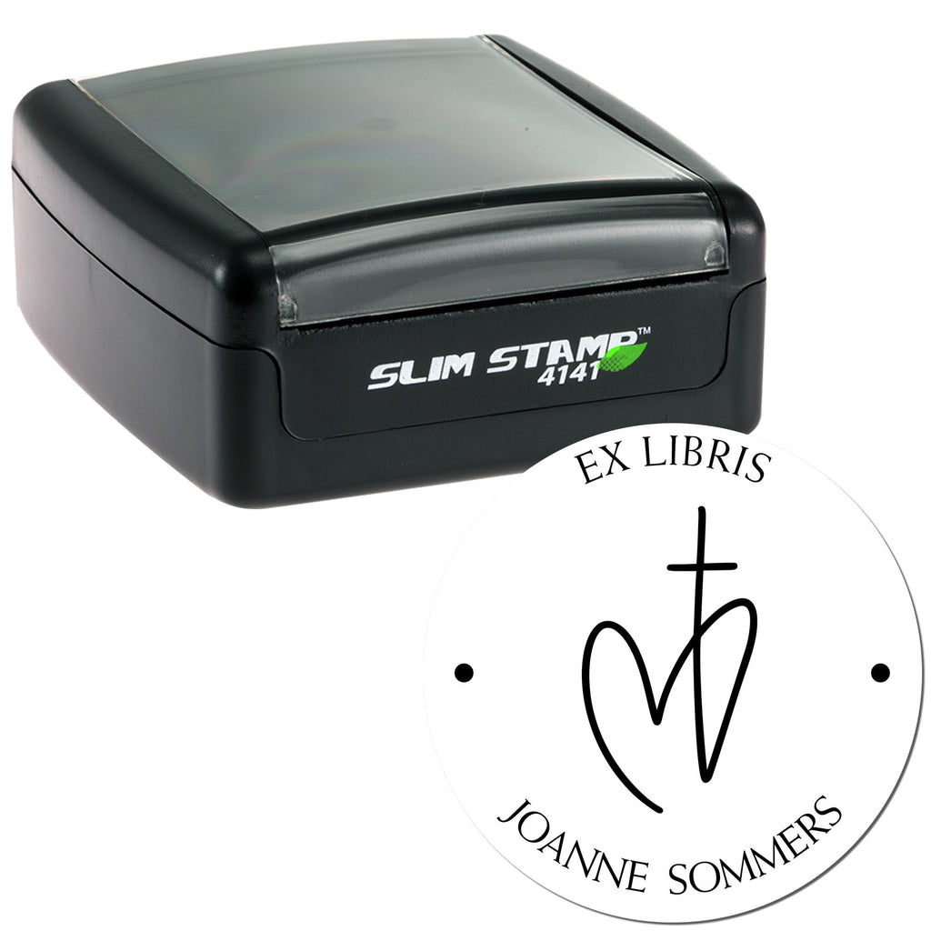 The design of our Portable Pre-Inked Transcendent Cross Customized Home Address Stamp features a beautiful center image of a Transcendent Cross with a heart, surrounded by elegant text. The clean round design includes phrases such as "This Book Belongs To," "From The Library of," and "Ex Libris" at the top arc, followed by your name or another saying at the bottom arc. The top and bottom arc texts are separated by two dots in the center, creating a sophisticated look that is sure to impress.