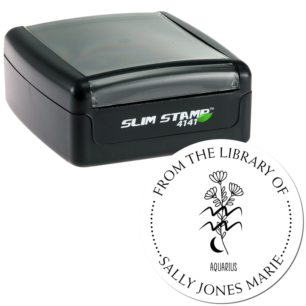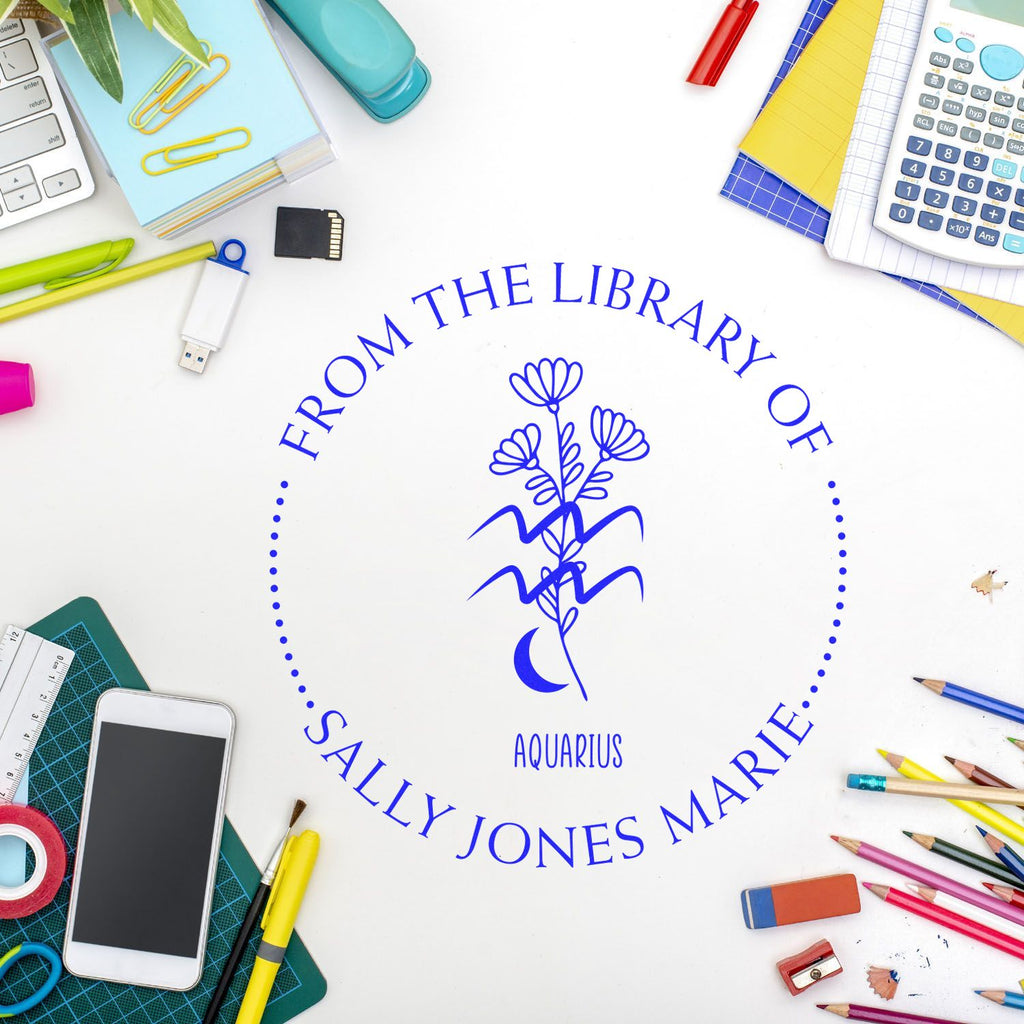 Pre-Inked Aquarius Zodiac Symbol with Flowers Customized My Library Stamp Highlights and Features