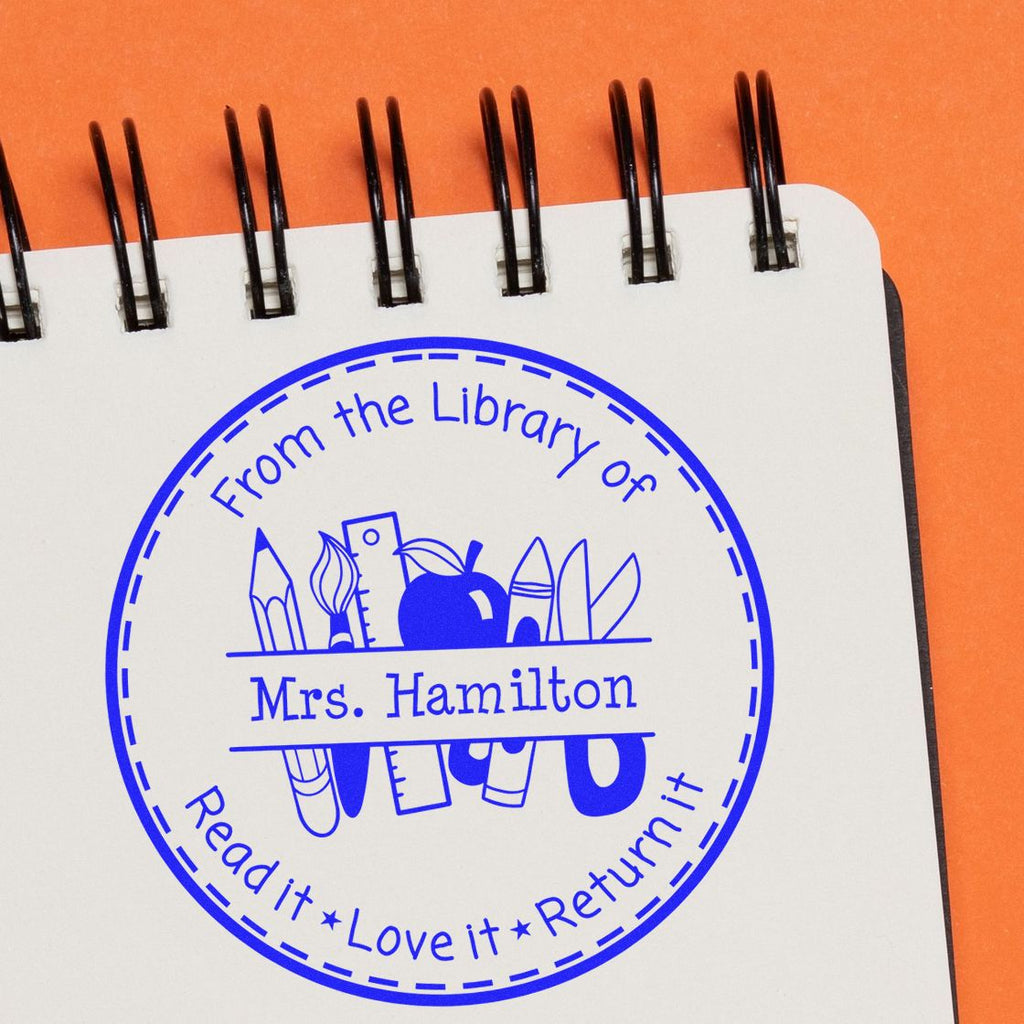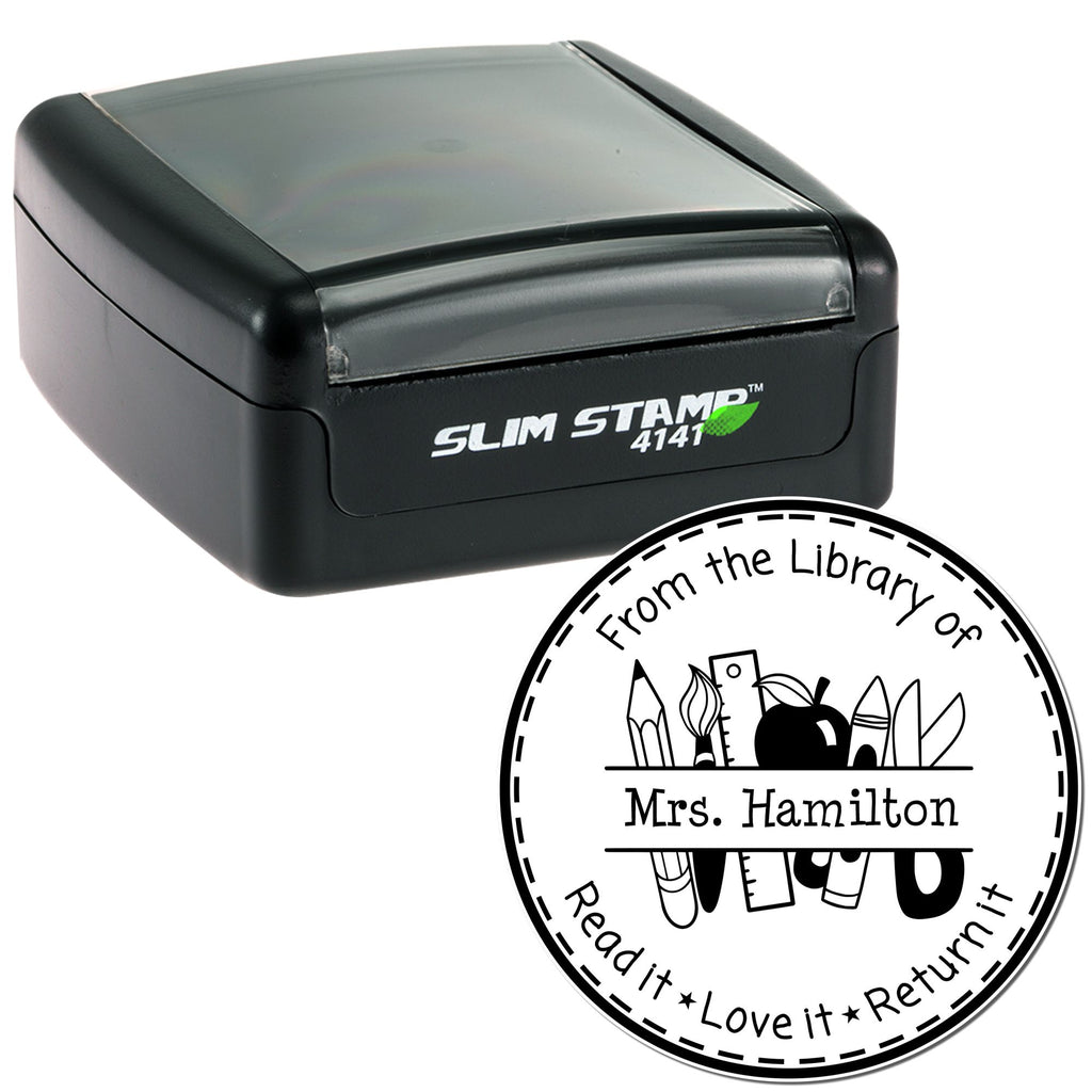 - CLASSROOM ORGANIZATION ESSENTIAL - Personalize your classroom library with this pre-inked stamp featuring charming school-themed graphics. Perfect for teachers marking up to 15,000 books before needing a re-ink. Fits comfortably in hand at 1-5/8" size.