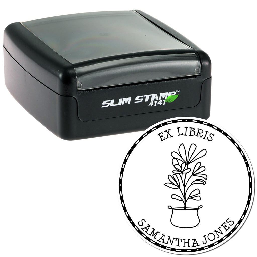 Stylish Design Meets Functionality The Pre-Inked Beauteous Flora Personalized Book Lover Stamp features a delightful design that includes a center image of a plant in a short vase, surrounded by a solid circle border filled with charming white dashes and dots. The phrases "This Book Belongs To", "From The Library of", and "Ex Libris" elegantly arch at the top, while your name or a personal saying can be beautifully displayed at the bottom arc. With an impression size of 1-5/8", this stamp is the perfect size to make a statement without overwhelming your book pages.