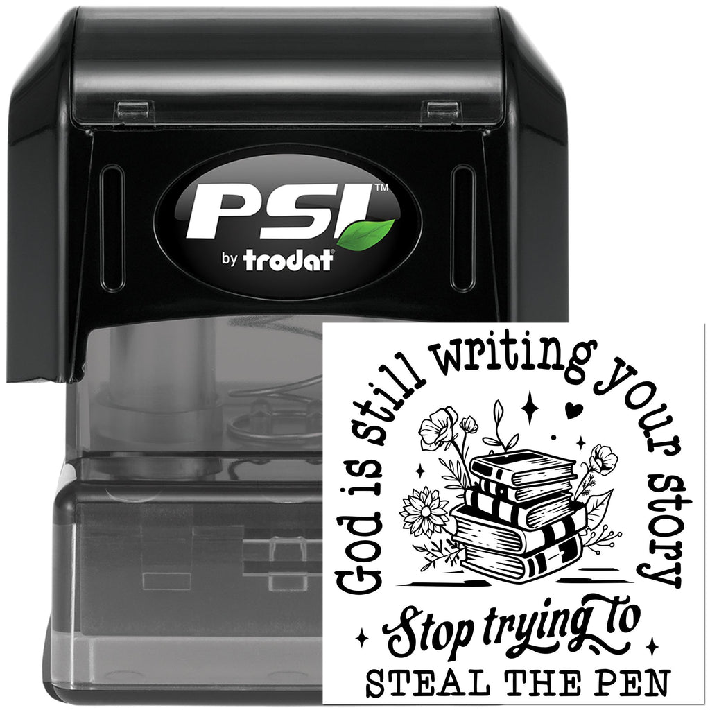 The playful monochrome illustration features a neat stack of books framed by blooming flowers and fluttering leaves, crowned with the curved sentiment, “God is still writing your story,” and finished with the bold script prompt, “Let go of the pen.” Tiny stars and hearts dot the design for extra whimsy — perfect for adding a literary flourish that feels handcrafted, even when stamped in seconds.
