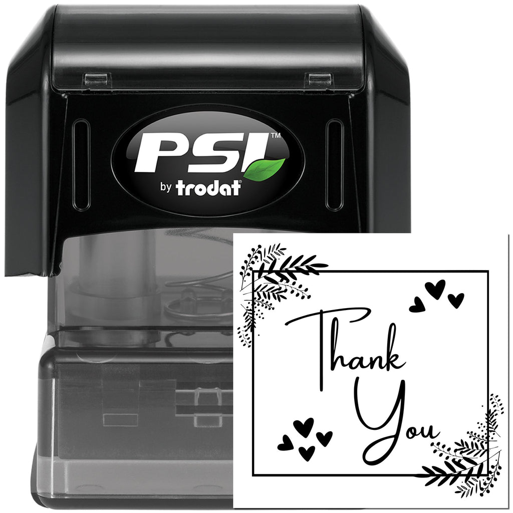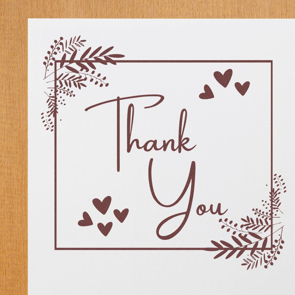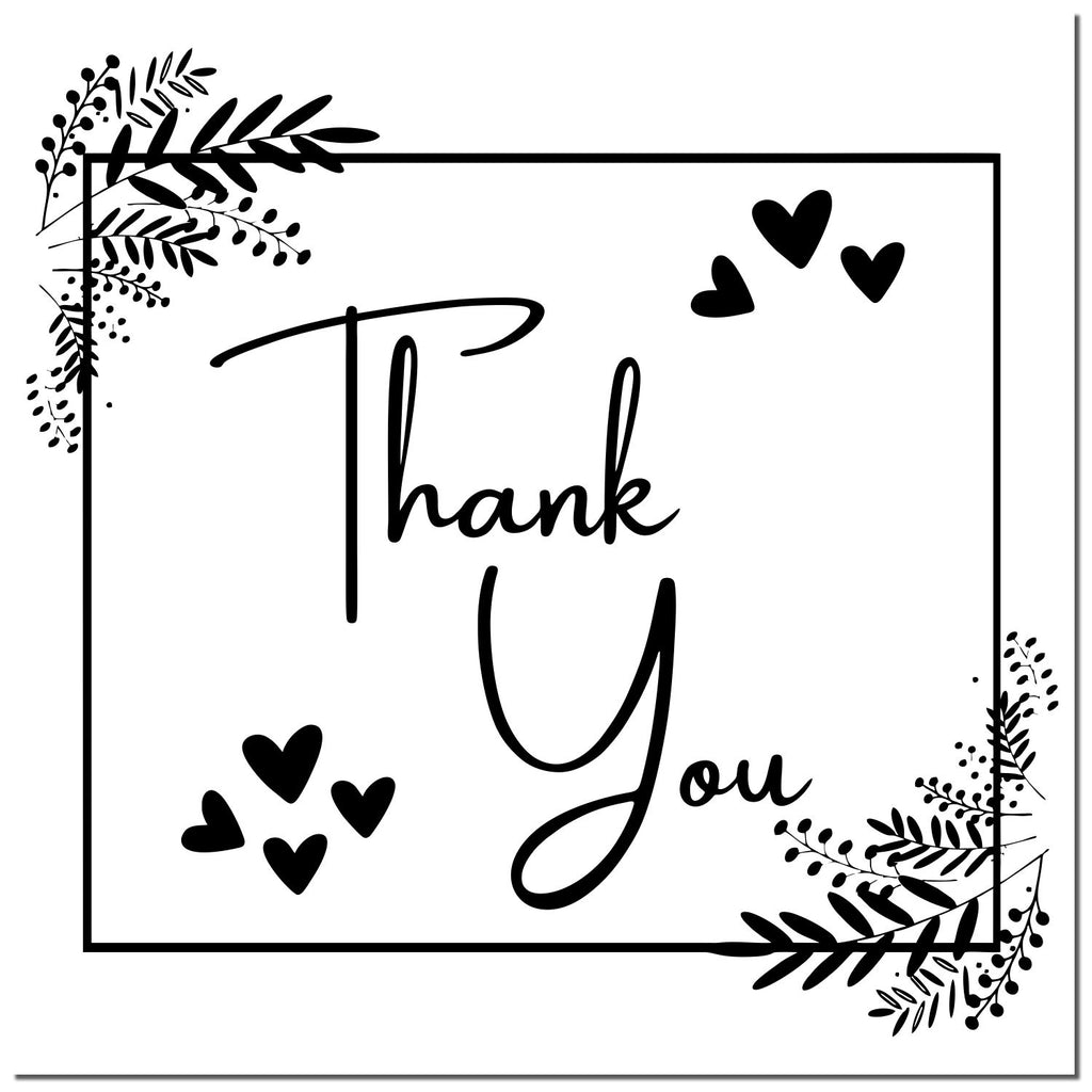 Crafted with meticulous attention to detail, our stamp features a graceful script "Thank You" message adorned with delicate botanical accents and subtle heart shapes, all perfectly balanced within a minimalist square frame. Each impression delivers the perfect combination of professional polish and personal warmth.