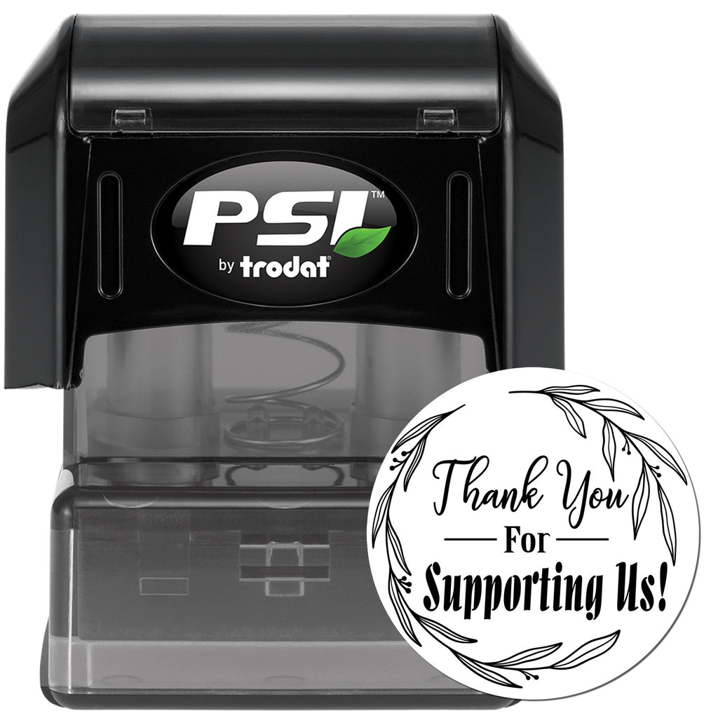 Featuring an enchanting circular design adorned with delicate botanical elements, this 1-5/8" round pre-inked stamp transforms every impression into a work of art. The graceful cursive "Thank You" paired with bold serif text "for Supporting Us!" creates a perfect balance of elegance and professionalism, all encased in a beautiful leaf wreath.
