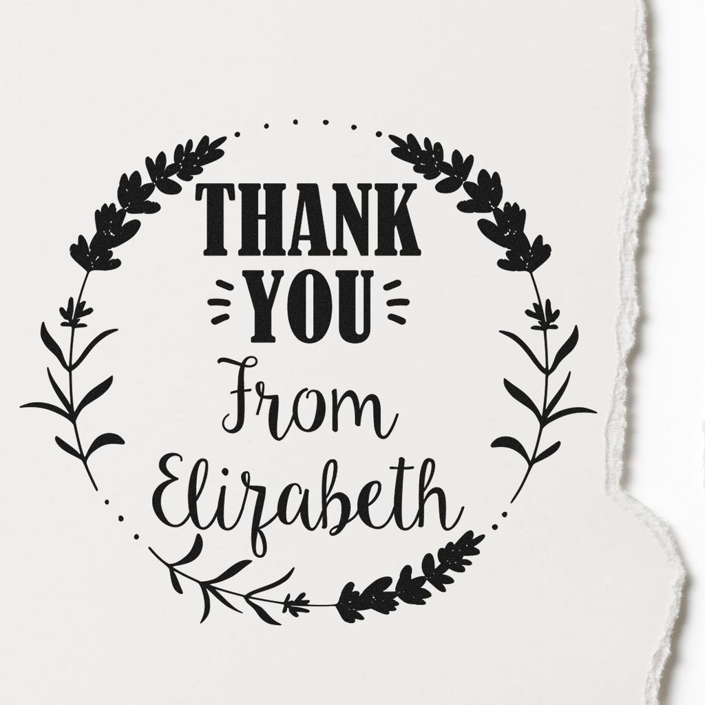 Unleash your creativity and elevate your brand with the Pre-Inked Botanical Wreath Elegant Gratitude Custom Thanks Stamp! Perfect for small business owners, this personalized rubber stamp is your secret weapon for adding a touch of elegance and professionalism to every package and note. Featuring a stunning 1-5/8" round design, this stamp showcases a delicate botanical wreath encircling the bold "THANK YOU" message, with "from Elizabeth" in a graceful cursive font. It's the perfect blend of style and sophistication, making every "thank you" unforgettable.