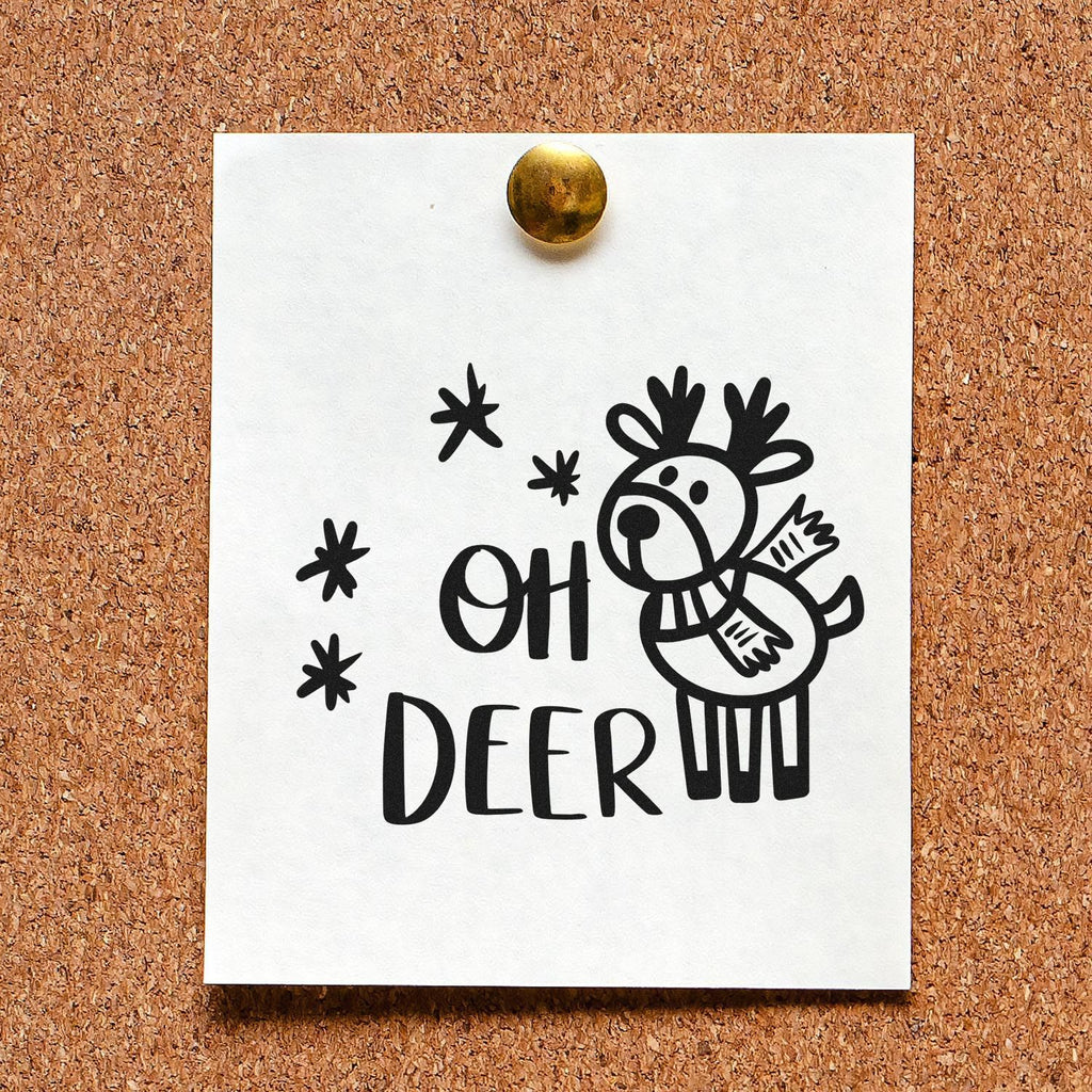 Whip up festive flair in seconds with the Pre-Inked Cheerful Christmas Reindeer Note Card Stamp — a 1-5/8" square stamp featuring a wide-eyed reindeer in a striped scarf, bold hand-lettered “OH DEER!” and swirling snowflakes for an instant dose of holiday cheer.