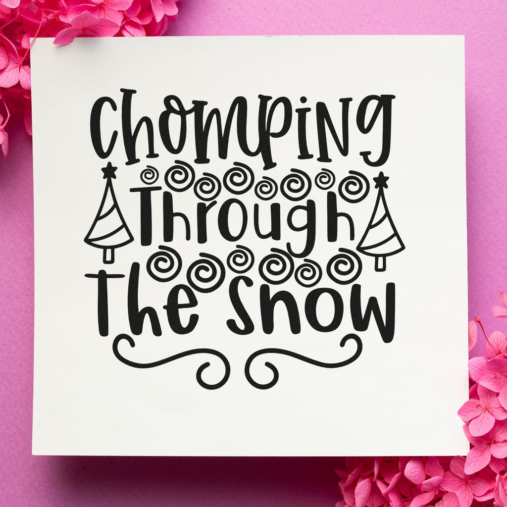 - Charm: Playful hand-lettered banner reading “Chomping Through The Snow,” snowflake swirls, and twin trees add whimsical winter flair to cards, gift tags, and scrapbook pages.