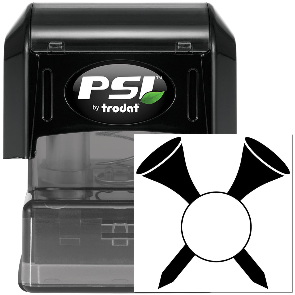 Celebrate rugged creativity with the PSI Pre-Inked Crossed Tools Emblem Scrapbooking Stamp — a bold 1-5/8" square stamp that delivers a punchy black-and-white graphic: a chunky white circle with a thick outline, two goofy horn shapes rising diagonally, and two tapering nail‑like tips crossed into a playful X.