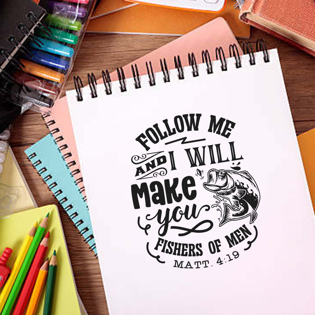 - Create consistency: 1-5/8" square Fisher of Men image and bold quote “Follow Me and I Will Make You Fishers of Men” (Matt. 4:19) gives every project the same sharp, professional look.