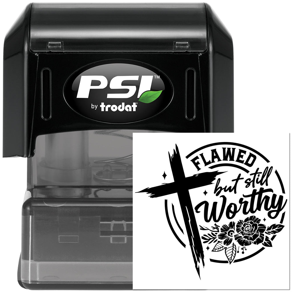 - Elevate your packaging: 1-5/8" square design with a bold splash-cross and circular frame that stamps “Flawed but still Worthy” in chunky plus cursive type for instant, heartwarming personality on tags and tissue.