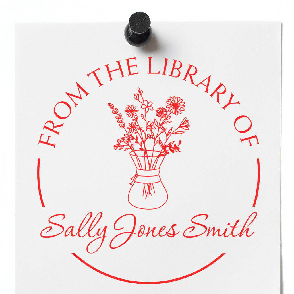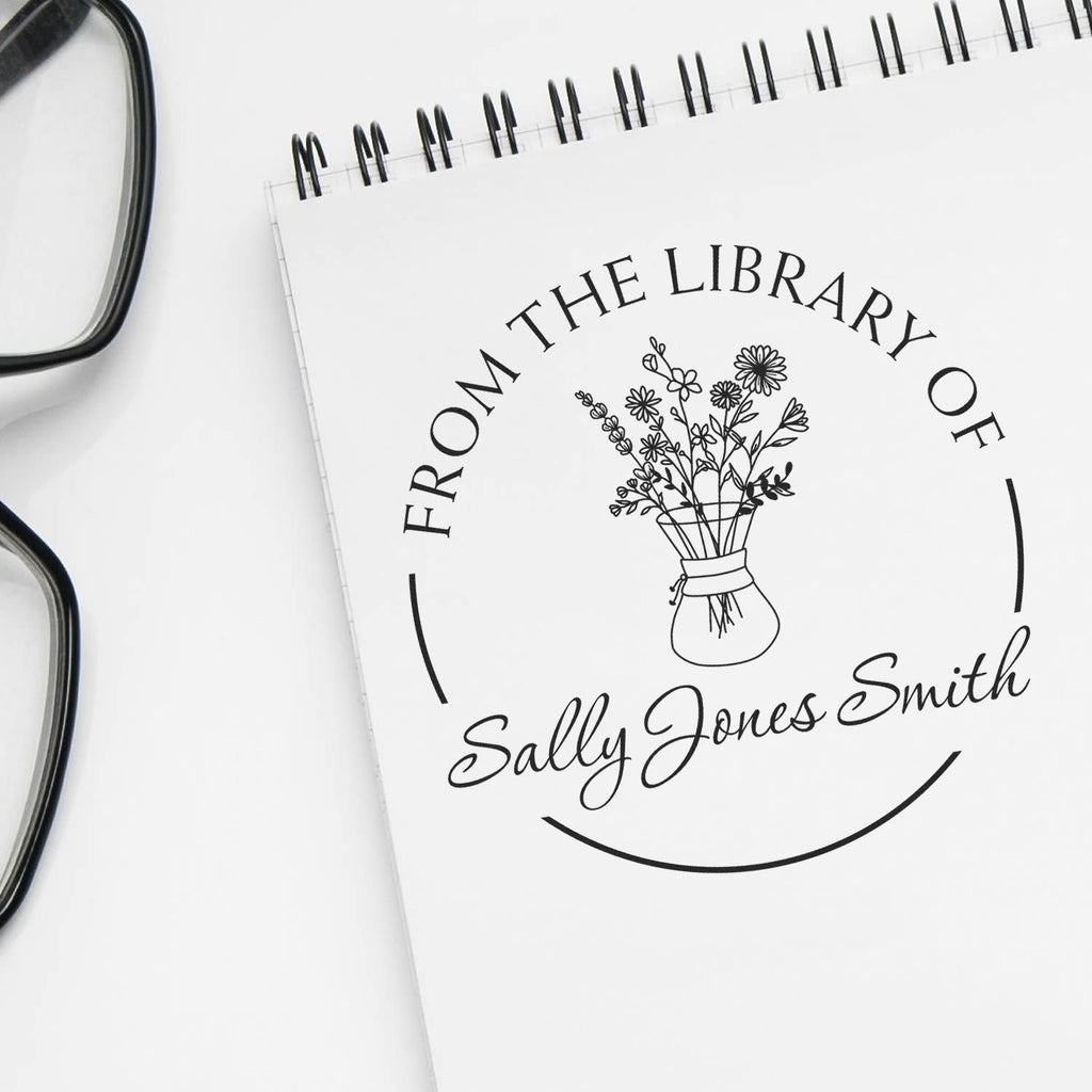 Sleek and Stylish Design Our slim stamps are revolutionizing the world of stamping with their sleek, pre-inked design that’s perfect for on-the-go use. Measuring at a compact 1-5/8" in diameter, this stamp is easy to carry and fits perfectly in your bag or desk drawer. The beautiful center image of flowers in a glass vase adds a touch of artistry to your stamping, making each impression not just a mark, but a piece of art. The clean round design features phrases like "This Book Belongs To", "From The Library of", and "Ex Libris" elegantly displayed, allowing you to personalize it with your name or a special saying.