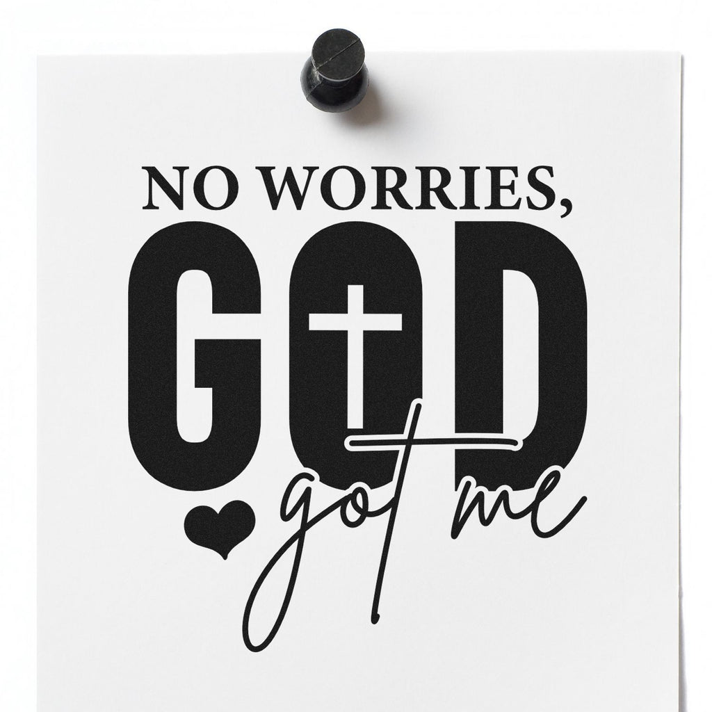Enjoy a bold, modern design that shares your faith at a glance: strong black “NO WORRIES” perched above a chunky, stylized “GOD,” with the “O” transformed into a white cross, a tiny heart tucked under the G, and a playful script declaration at the bottom: “got me.” This eye-catching artwork turns every tag into a mini testimony, reminding your customers that God is in control.
