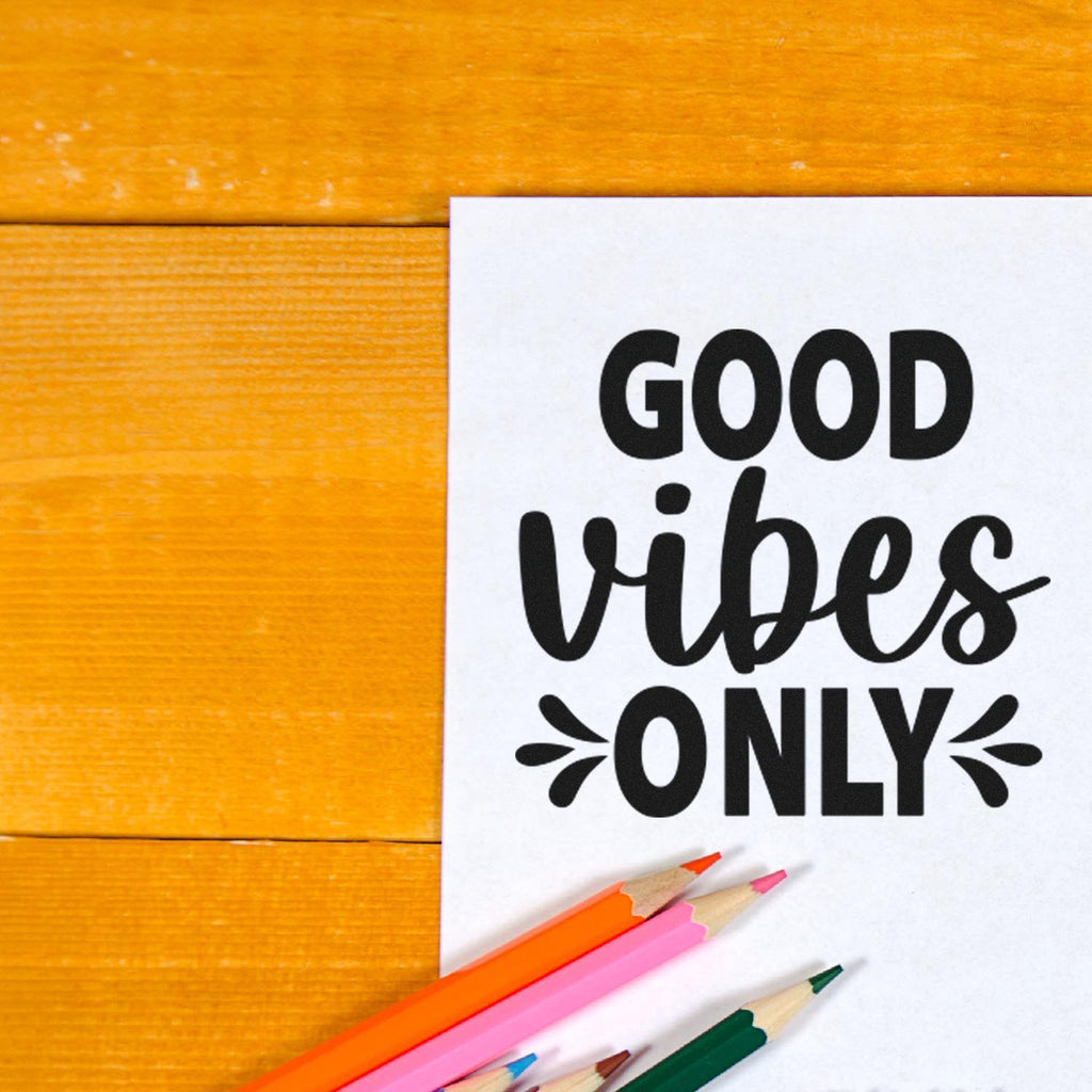 - Design-ready: Bold black-and-white “GOOD VIBES ONLY” artwork—chunky block letters with breezy cursive and playful swooshes—adds upbeat flair to favors and crafts.