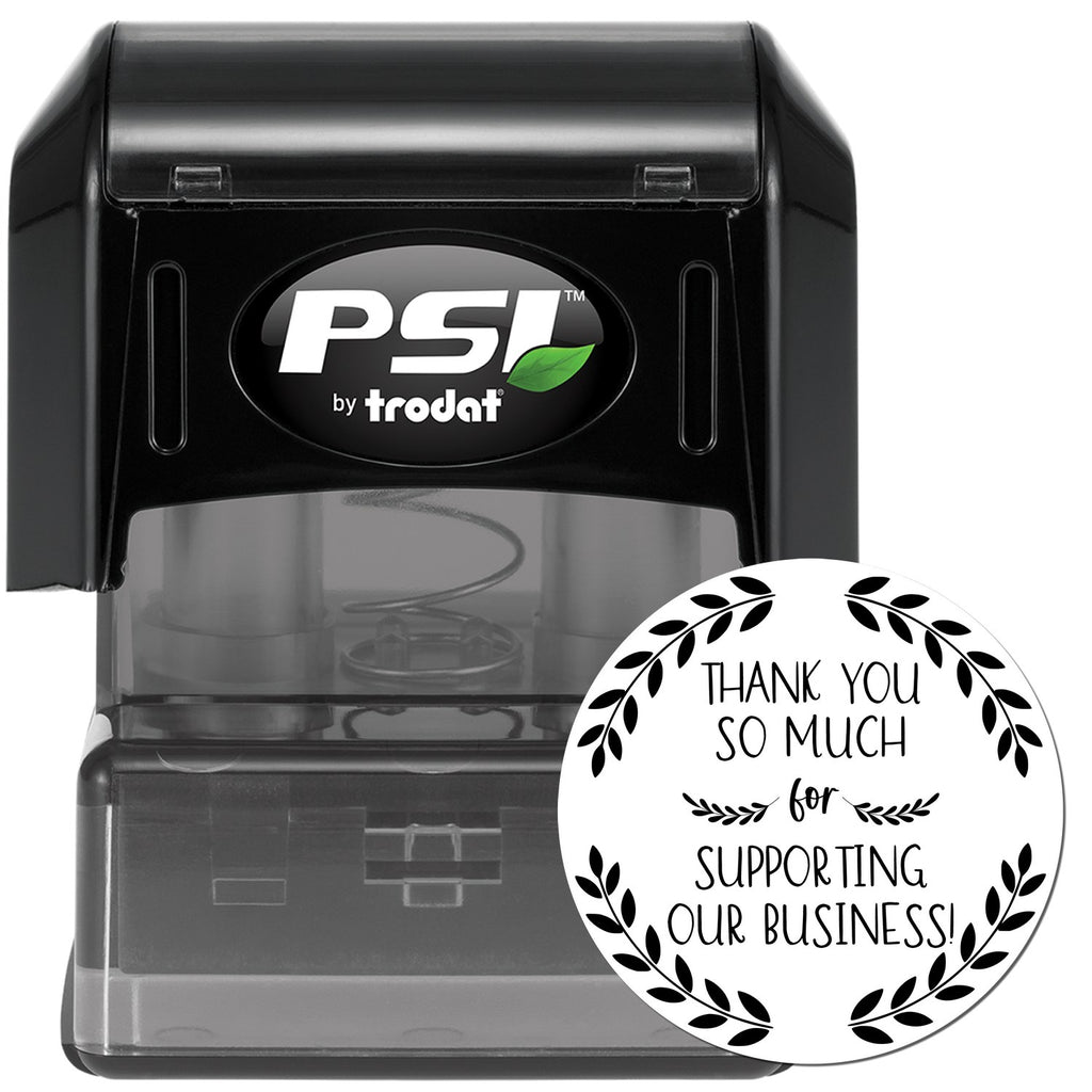 Unleash the power of gratitude with our Pre-Inked Grateful Business Laurel Custom Thanks Rubber Stamp! Designed for the discerning small business owner, this stamp is your secret weapon for adding a personal touch to every package, invoice, or receipt. With a heartfelt message that reads "Thank you so much for supporting our business!" framed by elegant laurel branches, this 1-5/8" round stamp is a masterpiece of style and sentiment.