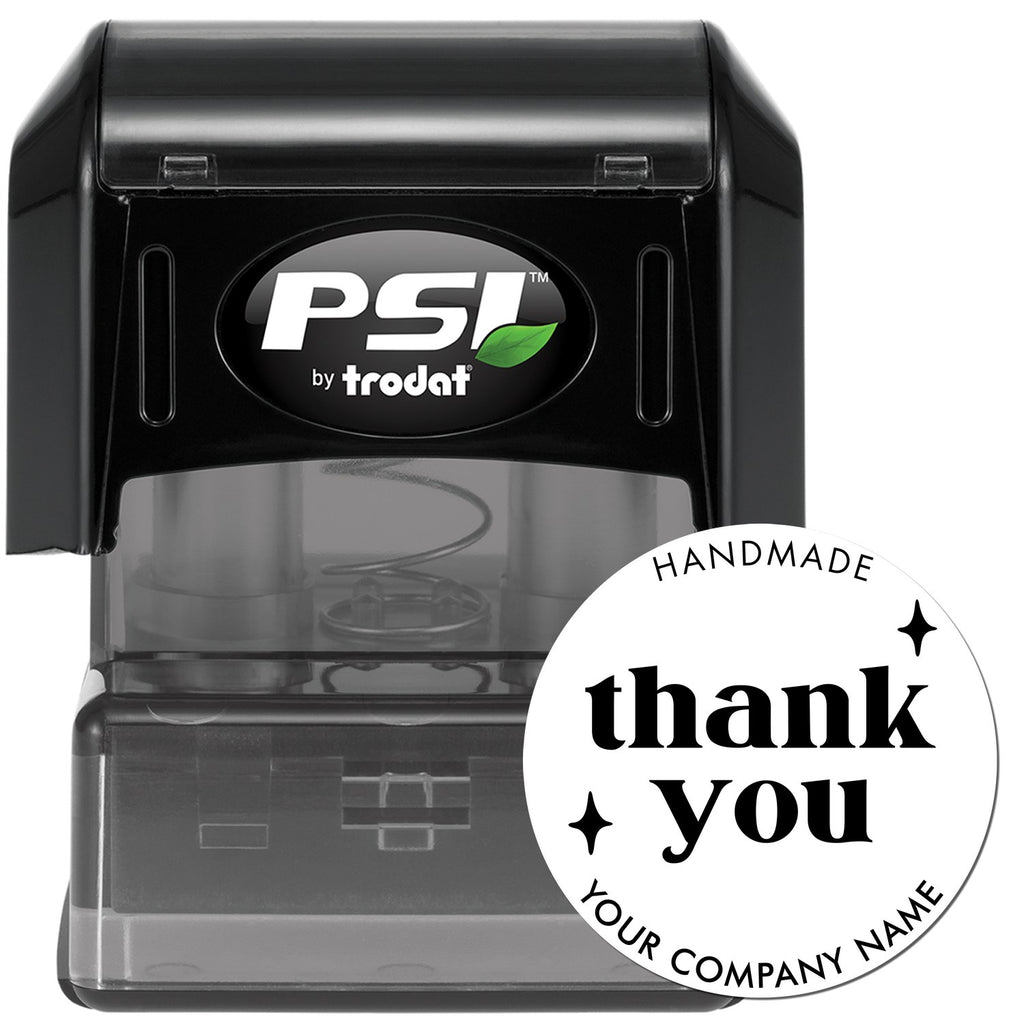 Crafted with precision, this 1-5/8" round stamper features a sophisticated design with "Thank You" prominently displayed in classic serif font, complemented by "Handmade" curved gracefully above and your custom company name below. Delicate star embellishments add a touch of refinement to every impression.