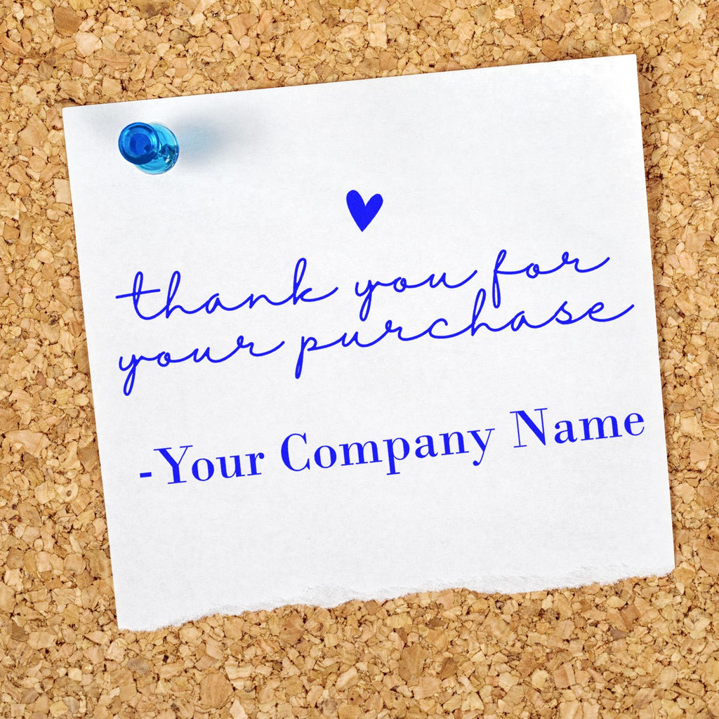At 1-5/8" square, this stamp is perfectly sized for versatility and impact. The exquisite thank you image features a delightful script font and a sleek, minimalist design, beautifully accented by a small heart above the message. The customizable space below allows you to add your company name, creating a personalized touch that speaks volumes of your gratitude. Show your customers how much you value them with this perfect expression of sincere appreciation.