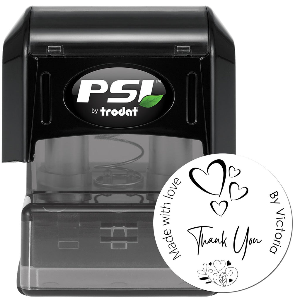 Crafted with the utmost attention to detail, this stamp features a beautifully circular layout adorned with five playful hearts, a graceful "Thank You" in cursive, and the words "Made with Love" and "By Victoria" in a modern font. The decorative elements of hearts, leaves, and swirls at the bottom add a whimsical touch, making each impression a work of art. Whether you're sending out thank-you notes, invitations, or business correspondence, this stamp adds a heartfelt touch that digital messages simply can't match.