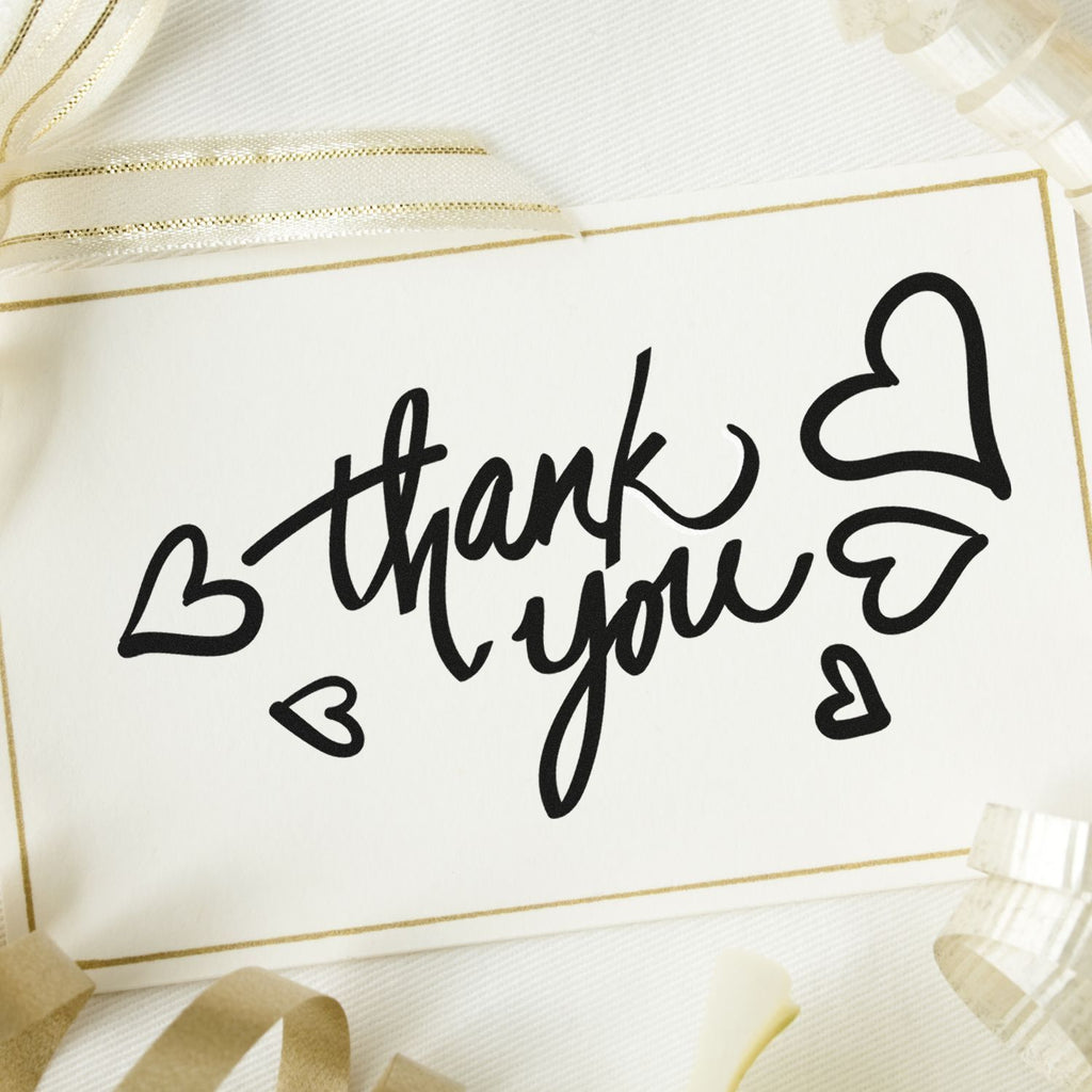 Crafted with precision, the stamper features a 1-5/8" square design that beautifully showcases the words "Thank You" in an elegant script, surrounded by whimsical heart doodles. This charming image exudes warmth and gratitude, making it the perfect addition to your holiday handmade stamp collection.