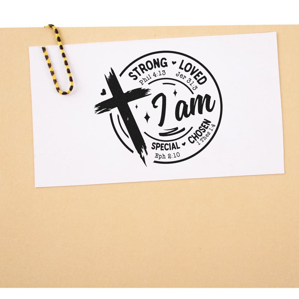 Limited-edition joy for your faith-filled crafts — the Pre-Inked “I Am Chosen” Scrapbook Stamp brings bold encouragement to every page with a playful brushstroke cross, round badge, and sweeping “I am” script surrounded by STRONG (Phil 4:13), LOVED (Jer 31:3), SPECIAL (Eph 2:10), CHOSEN (1 Thess 1:4) and tiny hearts for a lively, uplifting vibe.