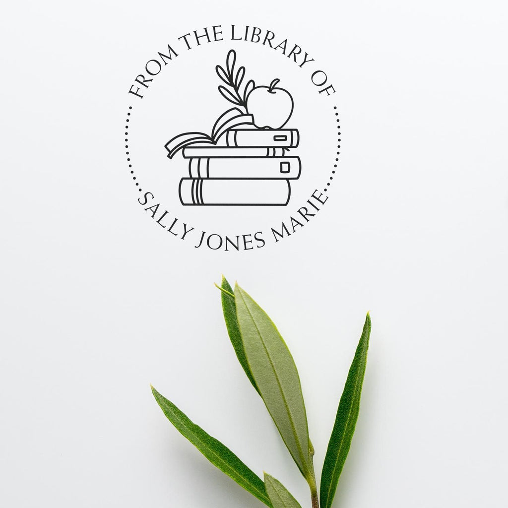 A Unique Touch for Your Collection Not only does a book name stamp help protect your collection, but it also adds a unique touch to each volume, making your library feel more curated and professional. The clean round design features a charming center image of imaginative classroom books and an apple, perfect for any teacher. With phrases such as "This Book Belongs To," "From The Library of," and "Ex Libris" elegantly displayed, you can customize the top arc with your name or another saying at the bottom arc, separated by a line of dots.