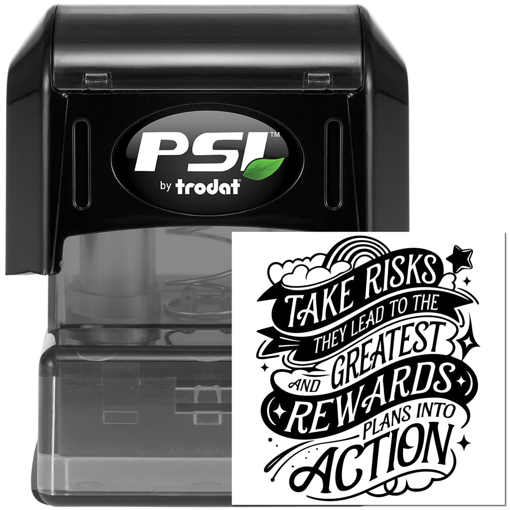 Nimble, bold, and bursting with optimism — this 1-5/8" Pre-Inked Inspirational Typography Art Postcard Stamp shouts, “Take chances, they spark the biggest rewards—turn plans into action,” in playful black-and-white lettering wrapped in wavy ribbons, twinkling stars, goofy rainbow accents and fluffy clouds for a joyful, energetic imprint every time.