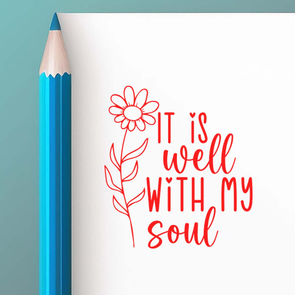 The "It Is Well" Pre-Inked Scrapbooking Stamp (1-5/8" square) brings peaceful inspiration to every page — a playful black-and-white sketch of a tall, skinny daisy with stretched leaves beside the phrase “It is well with my soul,” blending bold block letters and flowing script with tiny heart-dotted i’s for minimalist, serene charm.