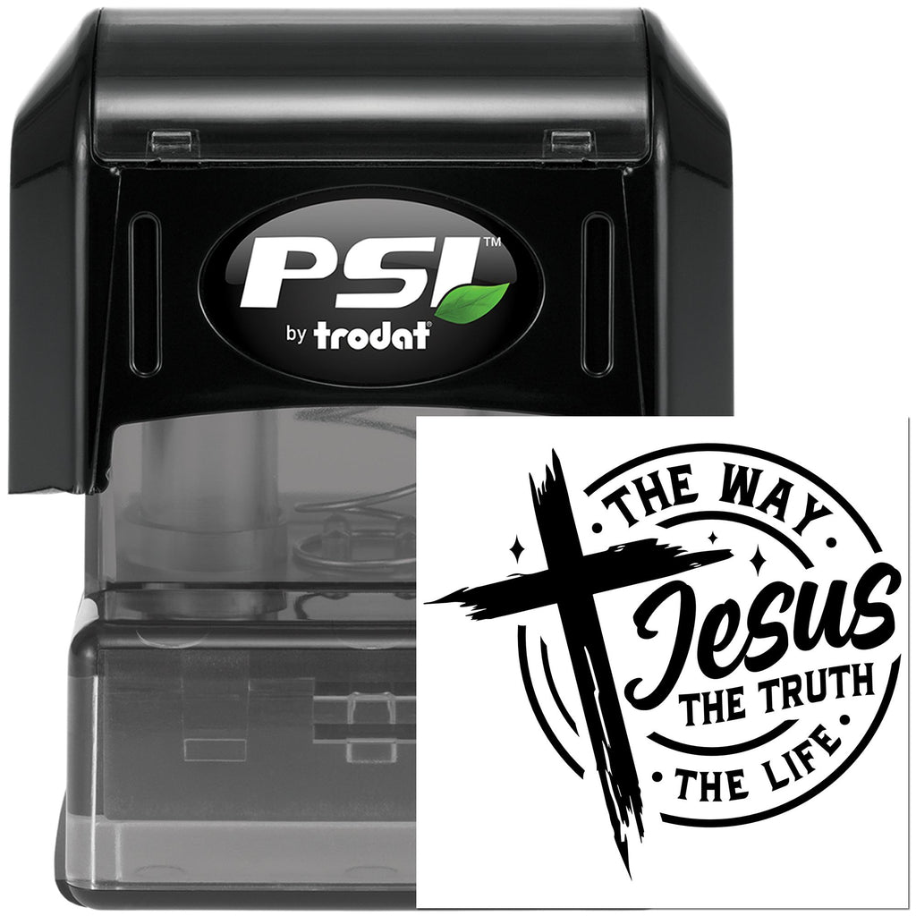Brighten your faith-filled creations with the PSI Pre-Inked Jesus The Way Craft Stamp — a 1-5/8" square powerhouse featuring a bold, splashy cross at the center, encircled by “The Way, The Truth, The Life” and “Jesus” in large, flowing script across the middle to create an instant, beautiful focal point for cards, scrapbooks, banners, and classroom projects.