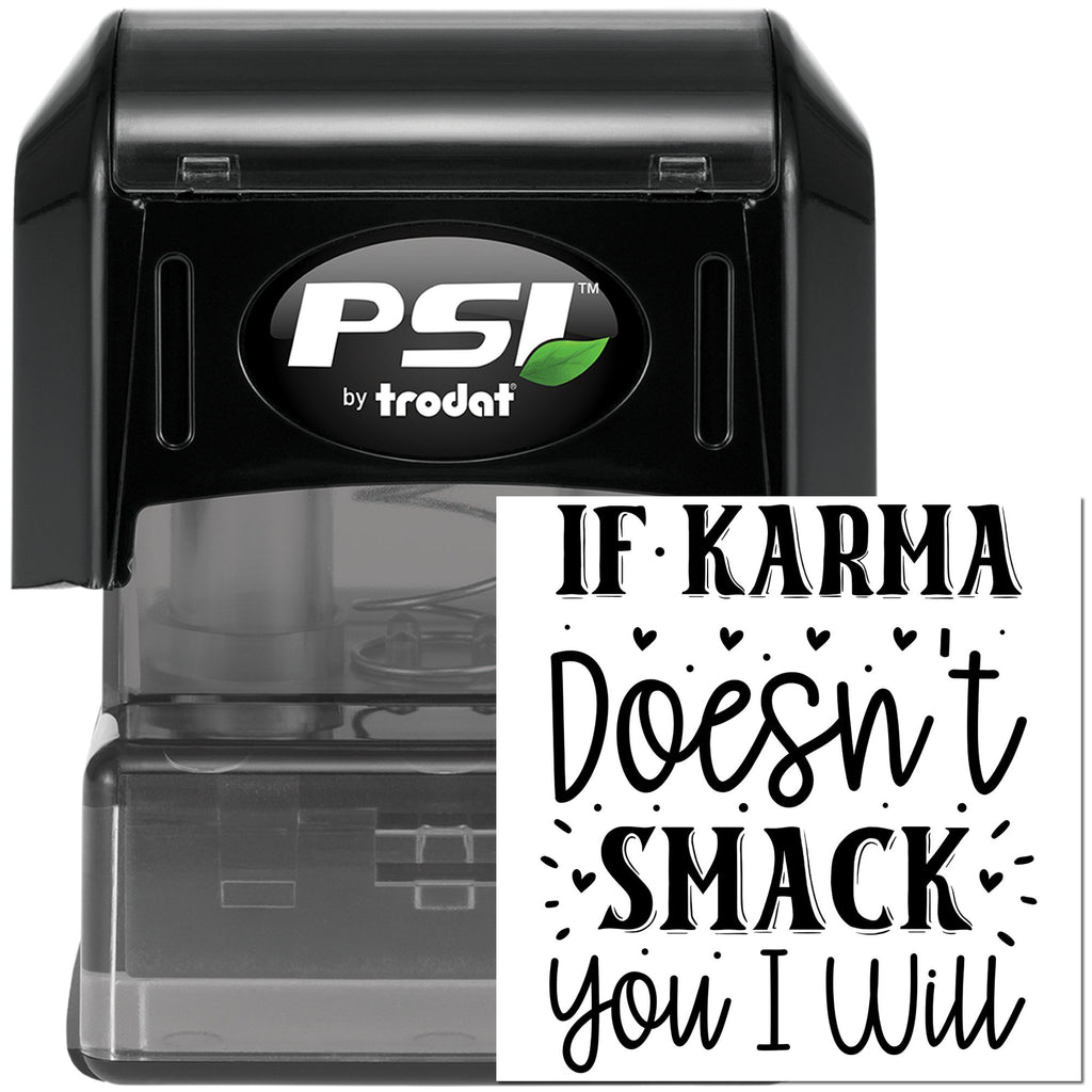 The Pre-Inked "Karma Comes Back" Papercraft Stamp is a cheeky 1-5/8" square must-have for scrapbook enthusiasts and handmade card makers — bold black lettering on white that reads "If karma doesn’t smack you, I will," accented with playful handwritten script, tiny hearts, dots, and flourish lines for instant personality on every project.