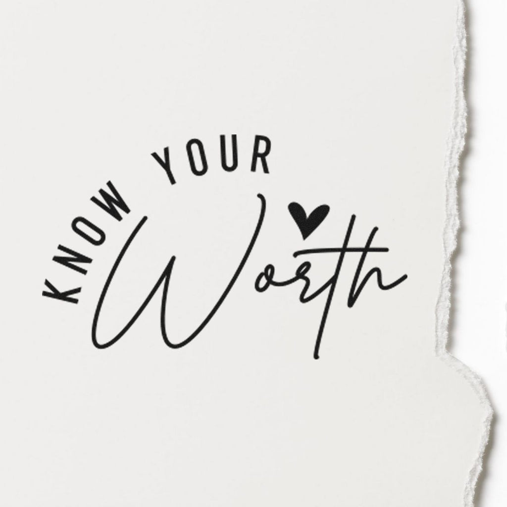 The design features a bold cursive "Worth" crowned by a playful heart and "Know your" arched above in clean all-caps — a black-and-white minimalist motif that pops on any paper and pairs beautifully with colored inks for layered texture and tone.