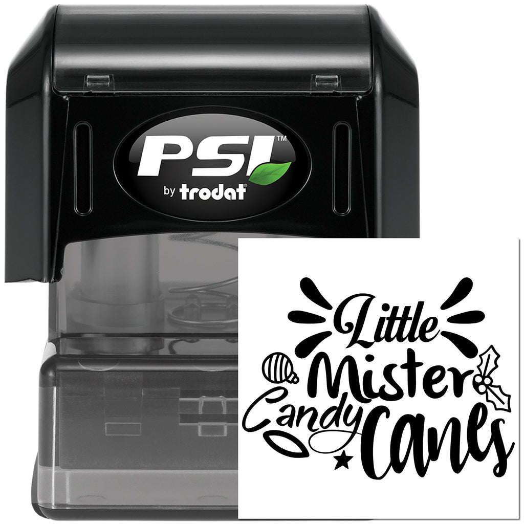 Designed especially for baby boy baby-shower planners and home-based confectioners, this candy favor personalization stamp makes it effortless to add a charming “Little Mister Candy Canes” message to chocolate bars, mints, sugar cookies, DIY candy jars, treat bags, and more. The playful hand-lettering, wrapped in a striped ornament, holly, star, and splash motifs, pops in bold black lines on white—keeping every impression crisp, merry, and irresistibly giftable.